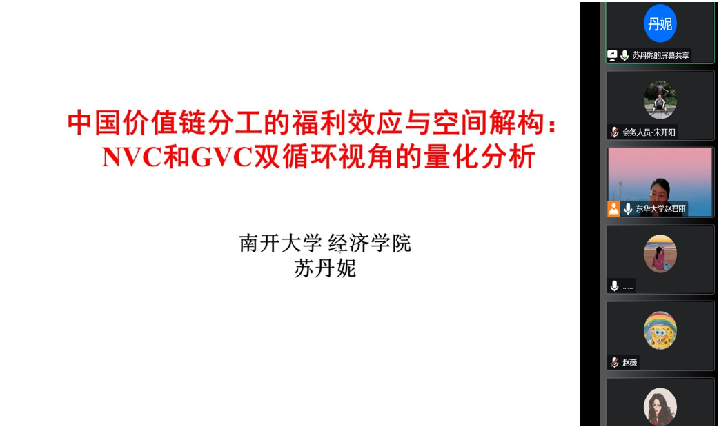 在线上召开了一场学术讲座。讲座主题为“中国价值链分工的福利效应与空间解构:NVC和GVC双循环视角的量化分析”,主讲人为南开大学经济学院苏丹妮副教授,主持人为肉番