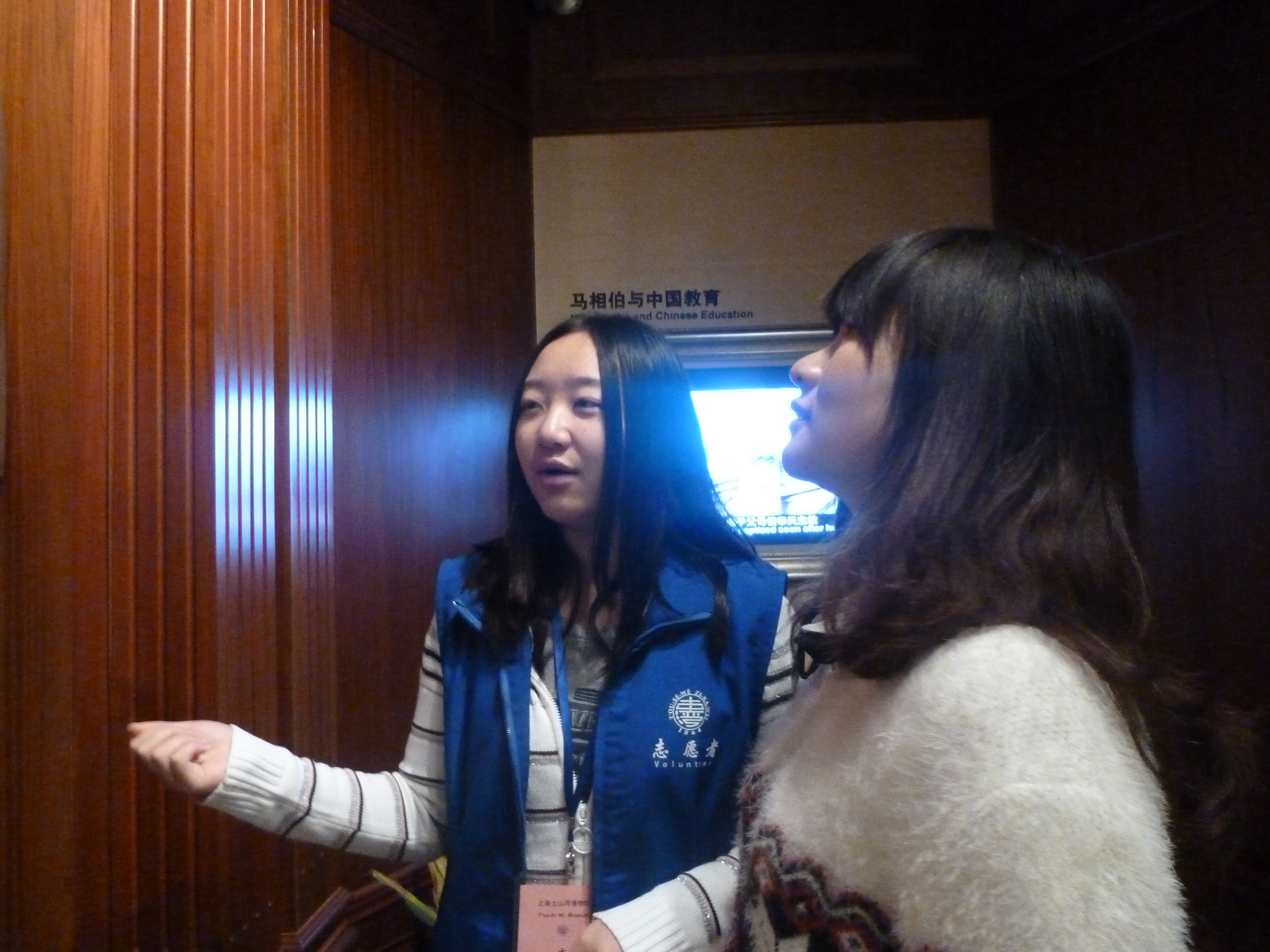 作为解说员,两位志愿者在游客有需求时非常热情地为他们讲解馆内各种展品的历史背景。一进门所能见的,便是“镇馆之宝”——黄杨木雕牌楼。这个宽5.2米,高5.8米的牌楼,造型精美,雕刻工艺极高,曾经历1915年,1933年,1939年三届世博会的展览。由传教士葛承亮的带领下,全院一同完成了这个杰作。游客面对牌楼,都不禁对其啧啧称奇。