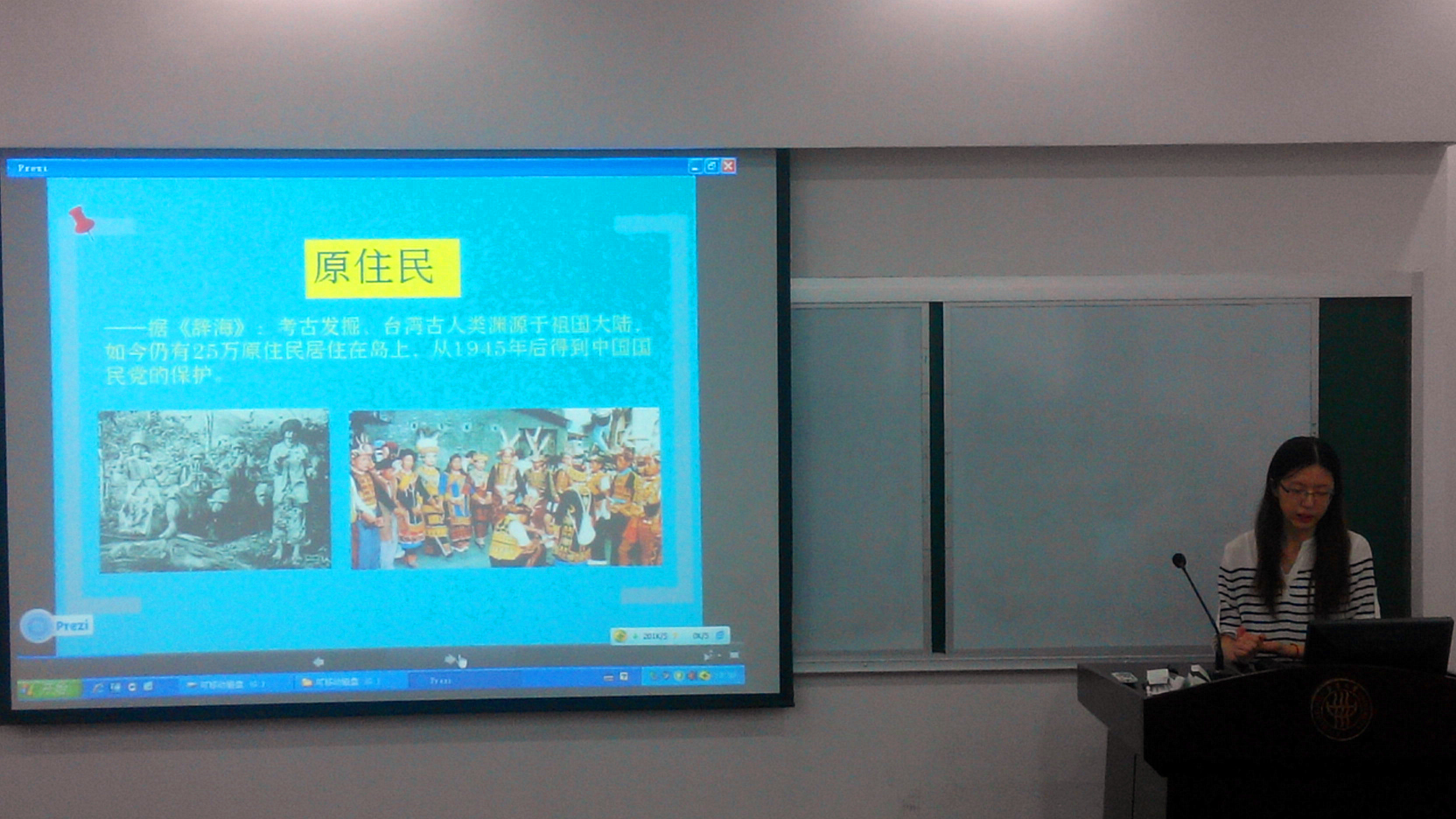 12级的狄蓉博士带领大家一同去领略了中国的宝岛——台湾的魅力。首先介绍了台湾的地理、人文、历史以及经济现状;接着重点介绍了台湾行的所见所感,从台湾的各种知名景点,像台北故宫博物馆、台北101、阿里山、日月潭、垦丁、鹅銮鼻公园以及太鲁阁到台湾的人性化交通,再到台湾的各种美食,像台北士林高雄六合等夜市上的小吃、水果,无不体现着台湾文化的美丽与魅力,使我们对宝岛台湾有了更深一步的了解,同时对其也充满了向往与憧憬。