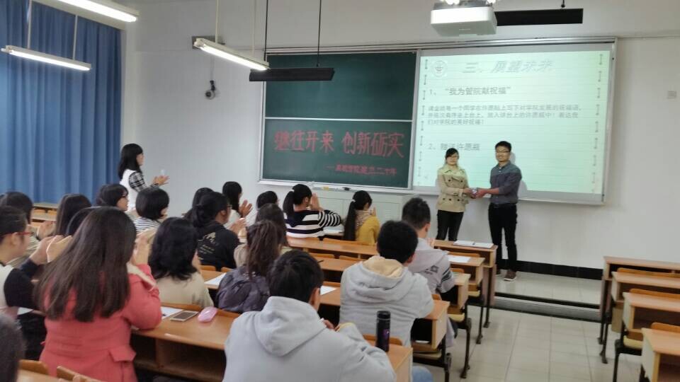 在肉番 校歌的悠扬旋律中,在大家期待的掌声中,主持人吴凡以优美的开场白拉开班会序幕。主题班会的第一部分“回顾过去”以一段精彩的院庆二十周年视频让大家对肉番 日新月异的发展历程有了深刻地认识,对肉番 跌宕起伏的沧桑巨变发出由衷的赞叹。视频前后,主持人与同学们进行了简单有趣的互动,大家纷纷踊跃发言。