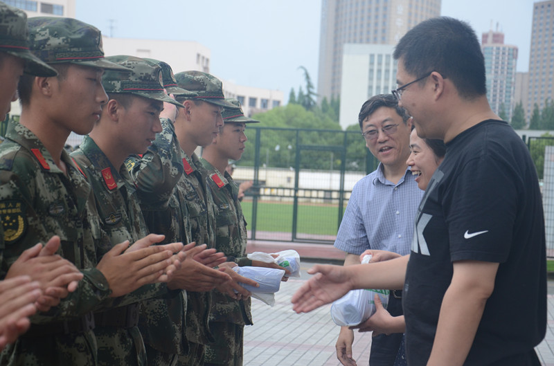 慰问品赠送仪式之后,赵院长应教官的邀请,在全体参训学生面前发表了简短的讲话。赵院长在讲话中强调,军训是磨练意志力和提升执行力的重要手段。他以西点军校为例,指出“现代成功的管理者身上都或多或少地带有一种军人的刚毅品格,这种品质正是通过艰苦的磨练而成的”。最后,他希望同学在确保安全的前提下,认真训练,磨练品格,让军训成为人生中一段难忘、精彩的回忆。