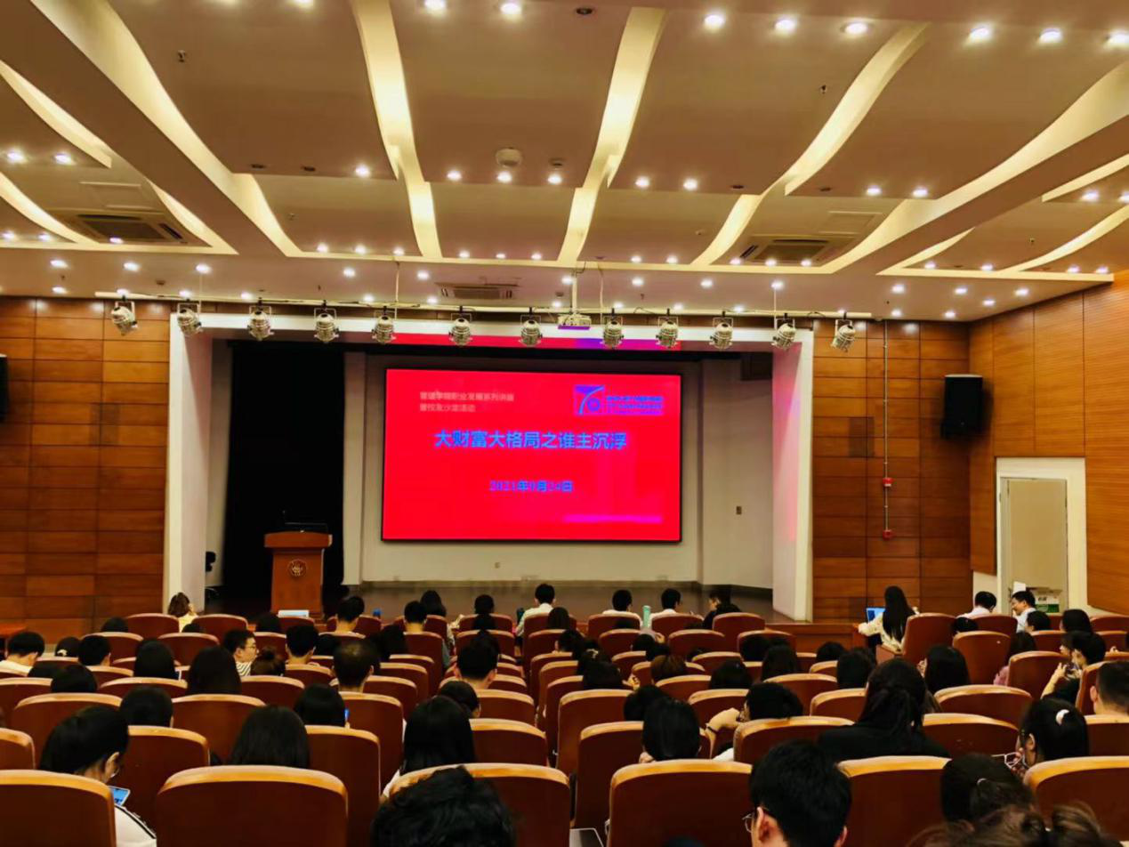 9月24日,中国光大银行北外滩支行行长、2012级企业管理校友潘彬彬,招商证券中山西路营业部总经理、2012级产业经济学校友蒋双喜,做客学院职业发展讲座暨校友沙龙活动,以“大财富大格局之谁主沉浮”为主题进行分享交流,300余名在校学生参加了活动。