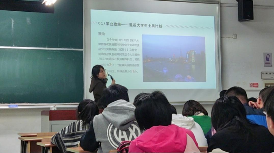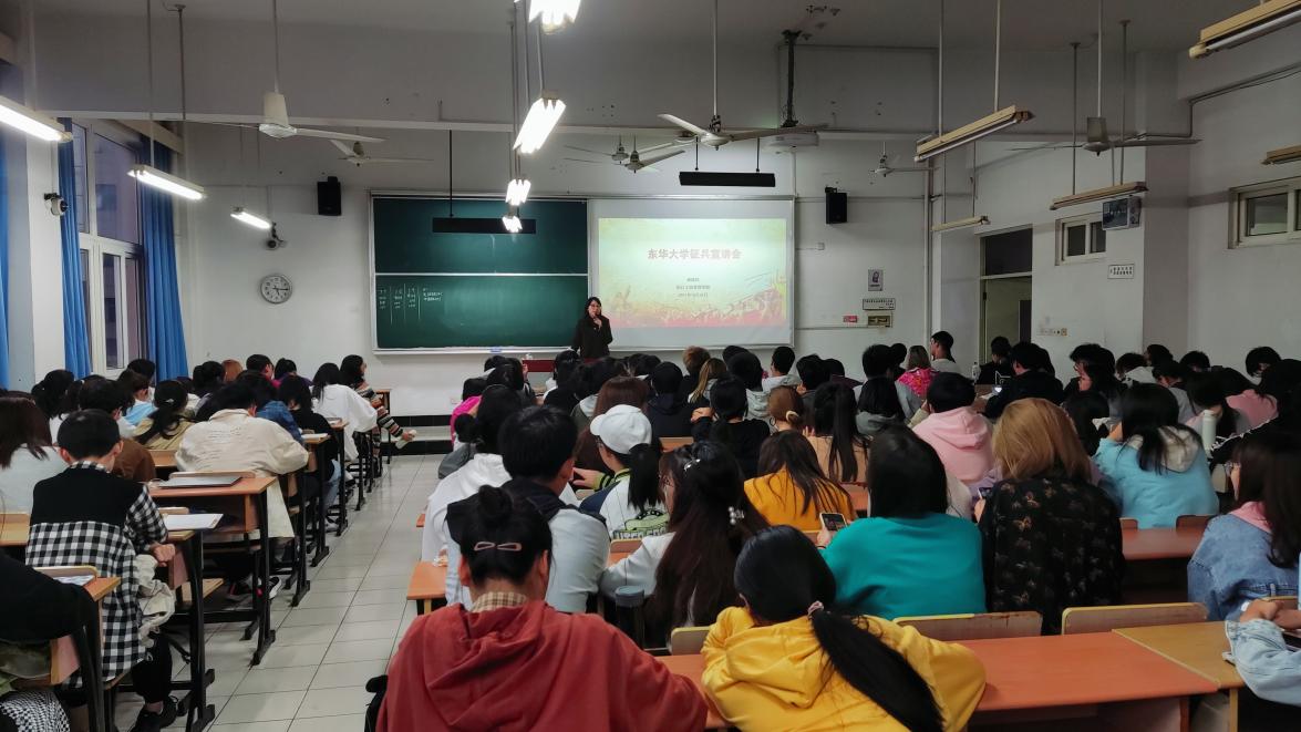 徐欣怡老师主要从国家需要、当代大学生入伍优势以及退伍学长学姐的故事三个方面作了精彩的政策解读与介绍分享,积极动员大学生应征入伍,激发学生们参军热情。