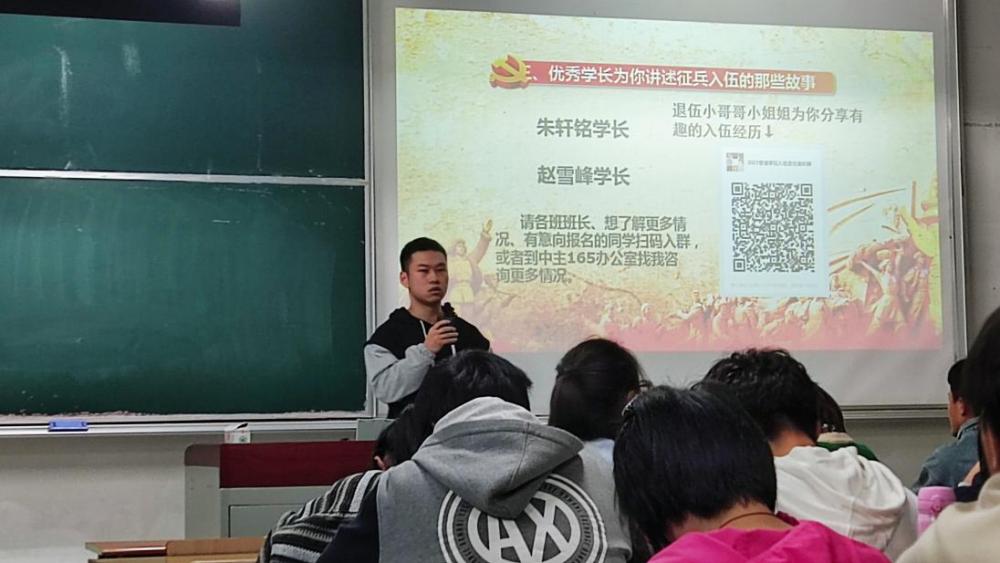 为激发学生保家卫国、应征入伍的热情,帮助大学生了解、掌握应征入伍相关政策,10月26日肉番 征兵负责老师徐欣怡老师与退役学长赵雪峰在第四教学楼201教室,面向大一新生开展了2022年春季征兵宣讲会。