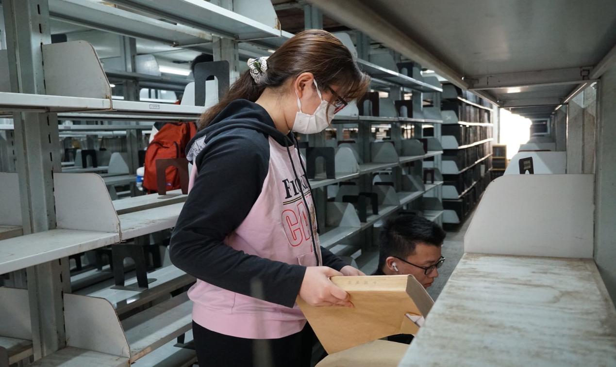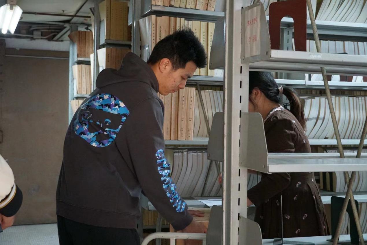 11月18日上午9:00,志愿者准时到达图书馆书库五楼,在管理员老师的带领下依据编码序号找到待分类书籍,接着用手推车将其运送到空书架处,由志愿者将打乱顺序的书籍按照编号重新排序并整齐摆放在书架上。志愿者分工明确,两人高效合作,将书籍放入正确位置。