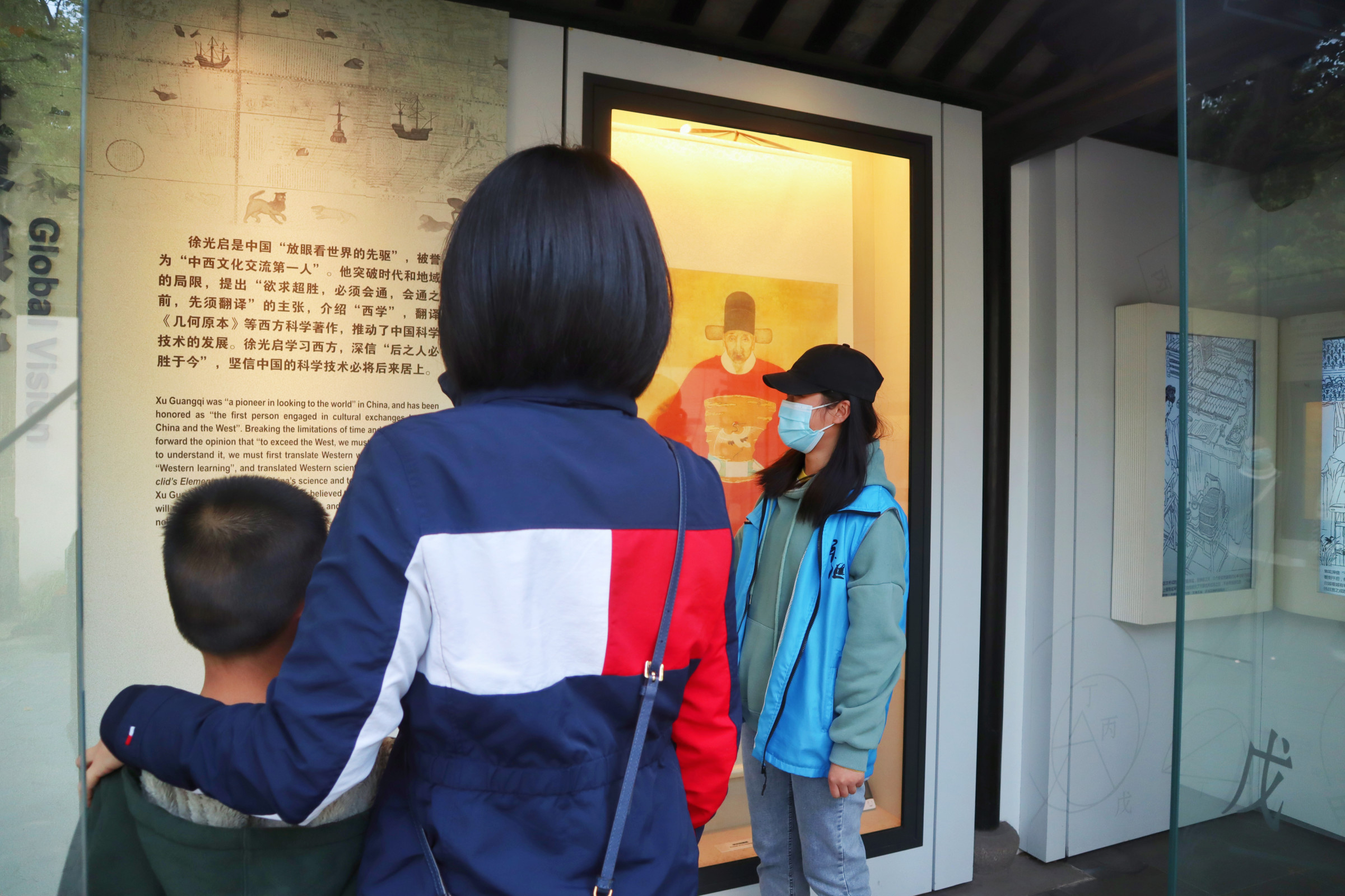 (志愿者为游客介绍徐光启先生)