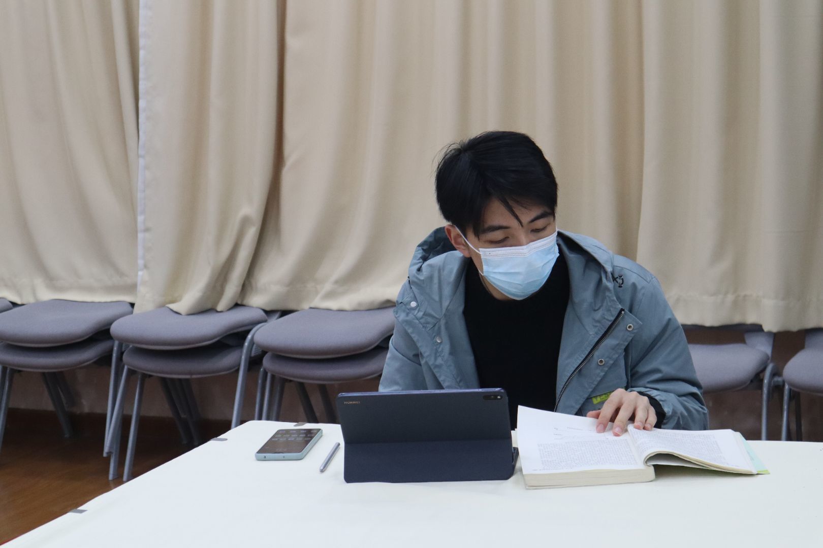 上午8:55,志愿者陆续来到服务中心,完成签到工作后,摆放好东西,准备迎接同学的到来。