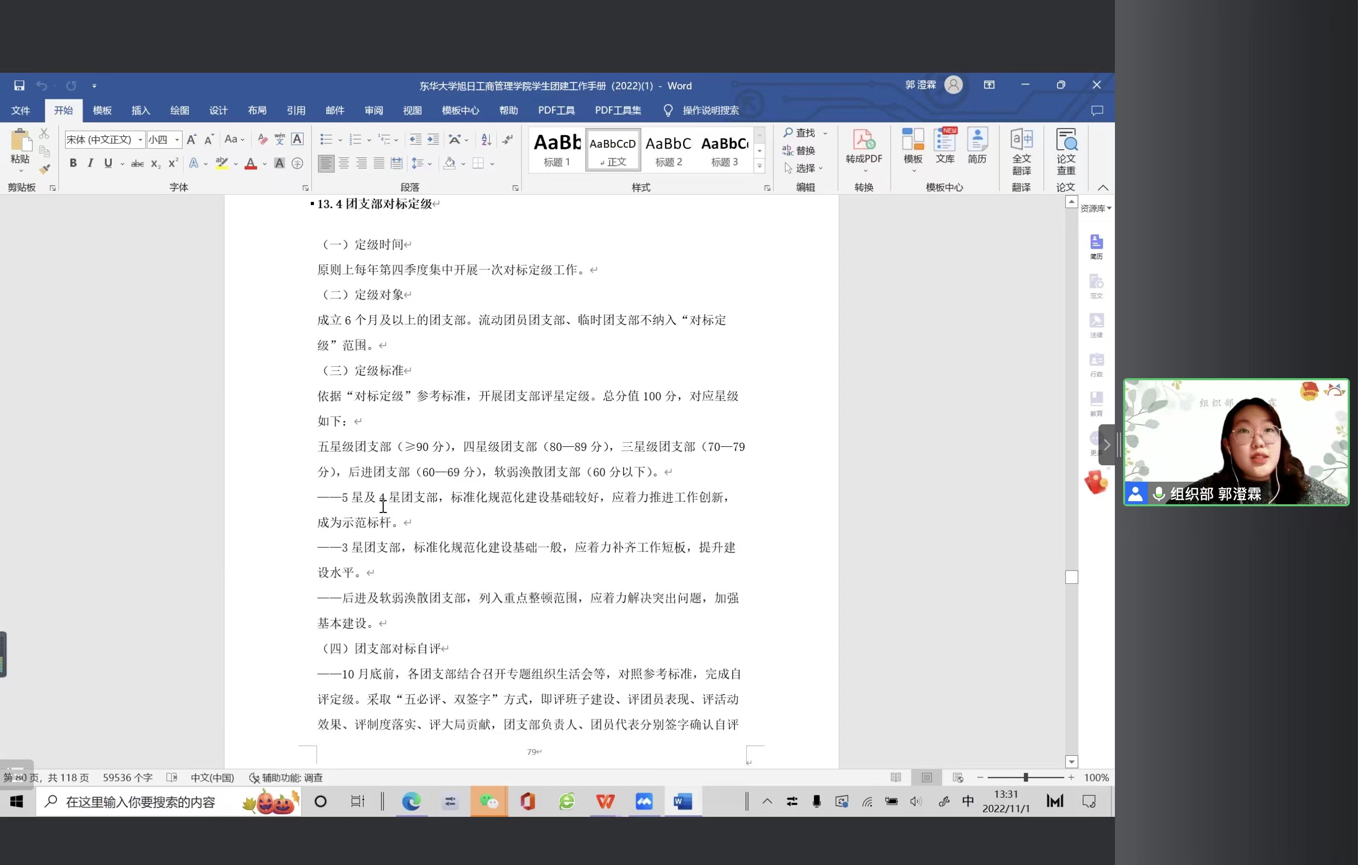 为了加强基层团支部规范化建设,提升团支书工作技能,肉番 团委组织部于2022年11月1日13:00在线上腾讯会议中召开了肉番 2022-2023学年团支书实务培训暨团支书工作经验分享会,肉番 团委书记邢俣霞老师、大一、大二、研一各团部支书记以及学院团委组织部全体成员参加。