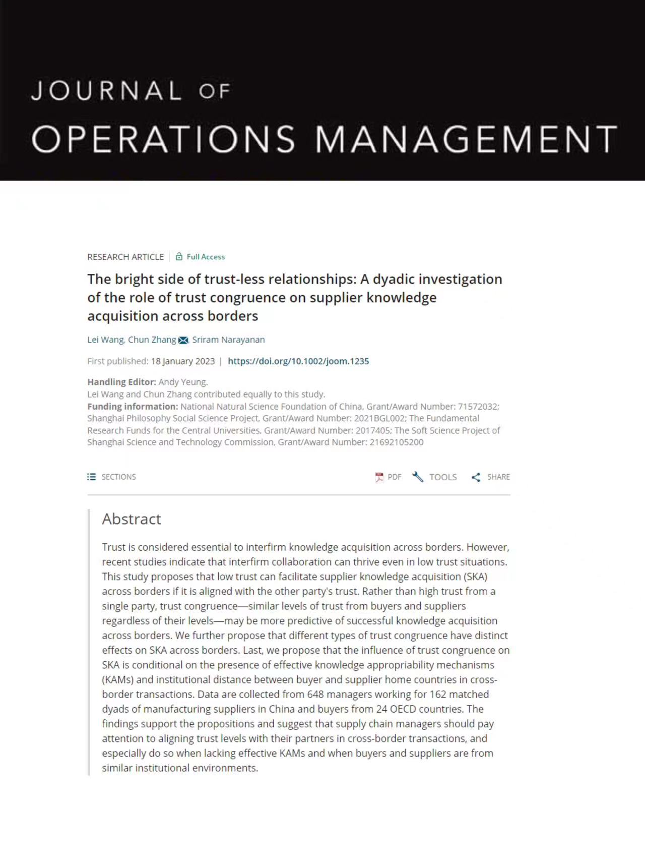 近日,我院应用经济系王雷教授以第一作者的身份在国际顶级学术期刊《Journal of Operations Management 》上发表了学术文章《The bright side of trust-less relationshipsA dyadic investigation of the role of trustcongruence on supplier knowledgeacquisition across borders》(《不信任的光明面:信任一致性对跨境知识获取的影响》)。该杂志是美国德克萨斯大学达拉斯分校(University of Texas at Dallas)所选出的商学院最顶尖24本学术期刊(简称“UTD-24”)之一,也是英国商学院协会(简称“ABS”)评选出的4星级期刊(级别最高)和英国金融时报认定用于国际商学院排名的50本卓越管理学期刊(Financial Times 50 Journals,简称“FT-50”)之一。