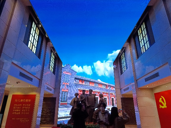 中共一大纪念馆,这座兴业路上的石库门楼庄严肃穆。推开厚重的大门,犹如穿越回一百年前的上海,13名中共一大代表挺拔站立的群体铜像,拉开了“伟大的开端——中国共产党创建历史陈列”展览的大幕,包含序厅、“前仆后继、救亡图存”,“民众觉醒、主义抉择”,“早期组织、星火初燃”,“开天辟地、日出东方”,“砥砺前行、光辉历程”和尾厅7个板块,采用有年代感的文物实物、图片图表、油画雕塑、实景还原、多媒体声像等多种形式,生动展现了中国共产党的诞生历程。