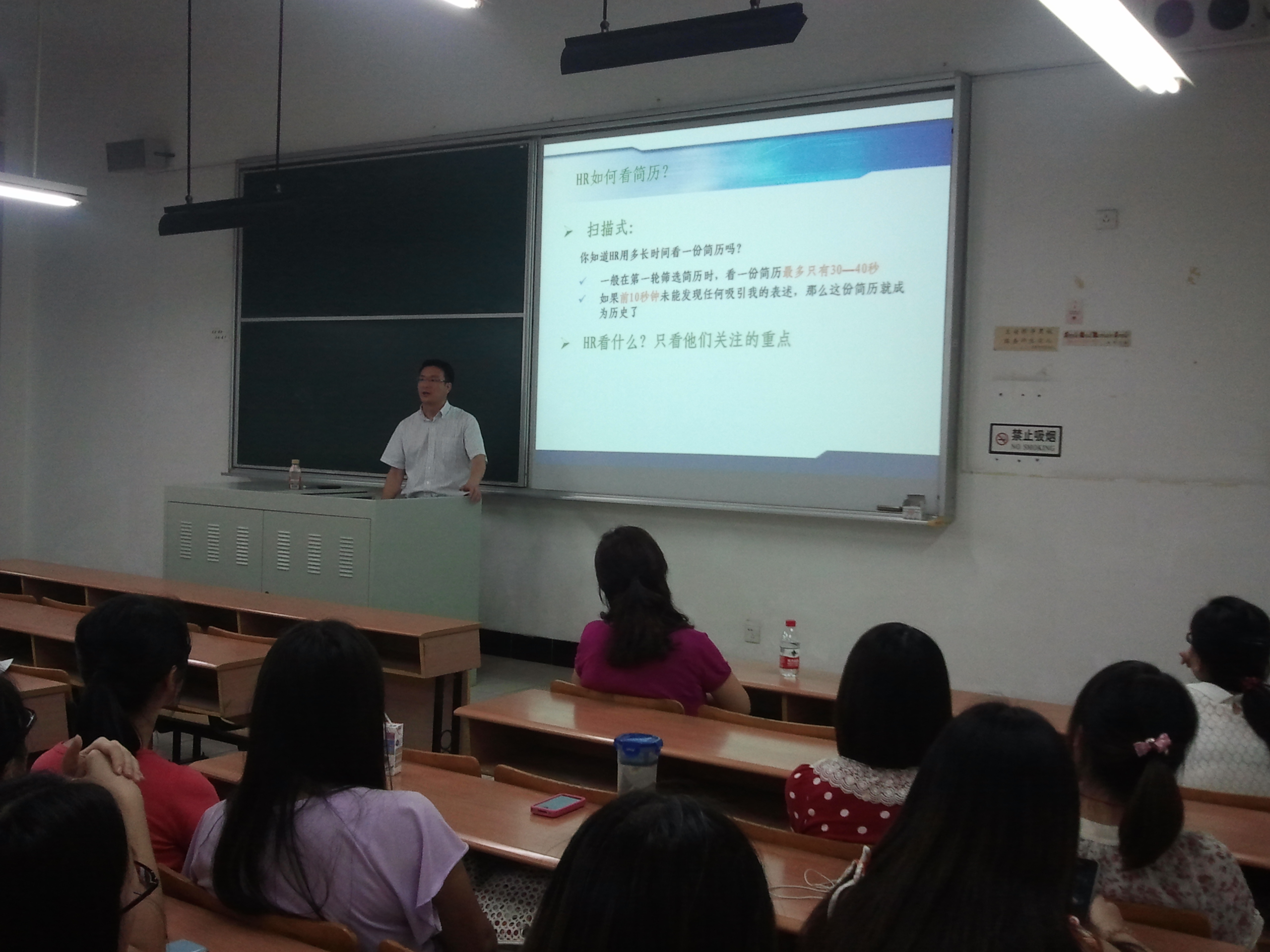 与此同时,辅导员老师高加加老师特别邀请了具有多年毕业班就业指导工作经验的黄洪涛老师为同学们就“简历制作”方面的注意事项与相关技巧进行了详细的解析与指导。黄洪涛老师运用生动典型的案例以及直观的对比分析,将简历制作过程中的写作原则及方法为同学们进行了全面的阐述。此外,辅导员老师高加加老师还与学生们一同分享了自己在求职过程中的经历与感受,鼓励并希望学生们为接下来的校园招聘做好充分的准备工作。 最后,辅导员老师高加加老师以“细节成就卓越”的激励之声为本次班会画上了圆满的句号。