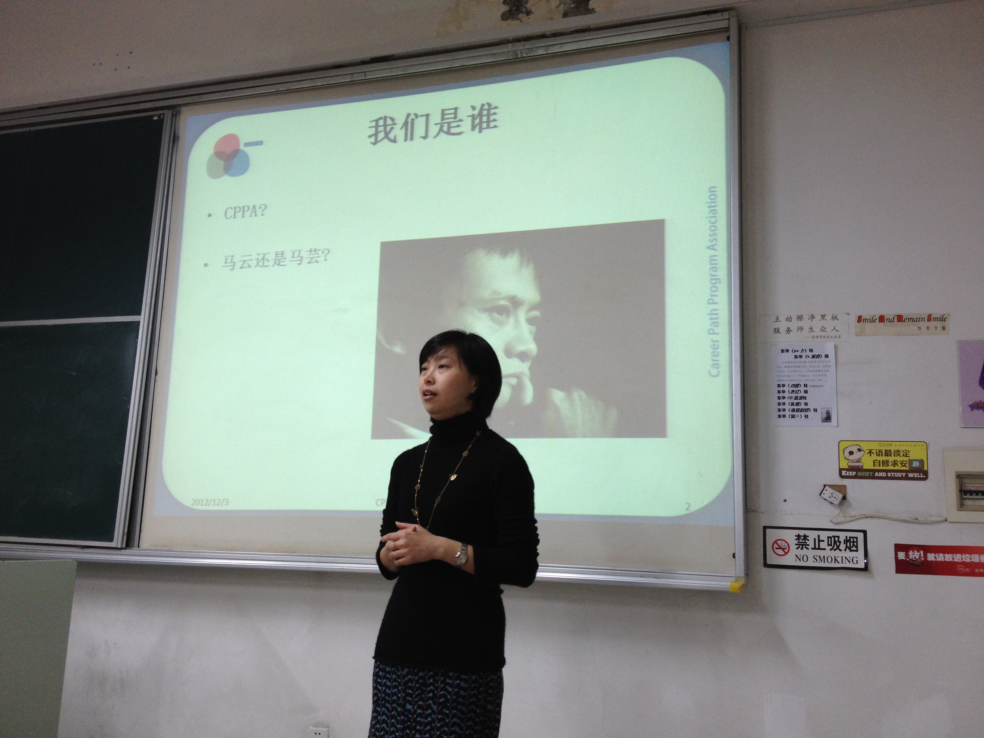2012年12月3日晚,肉番 2010级于4教110开展了工商大类职业生涯发展教育月系列活动之职场入门讲座,旨在为同学们将来的实习之路,求职关卡等做出引导。这次讲座我们有幸请来了Trairspace从事人力资源的马芸女士为同学们讲述职场入门这一课。