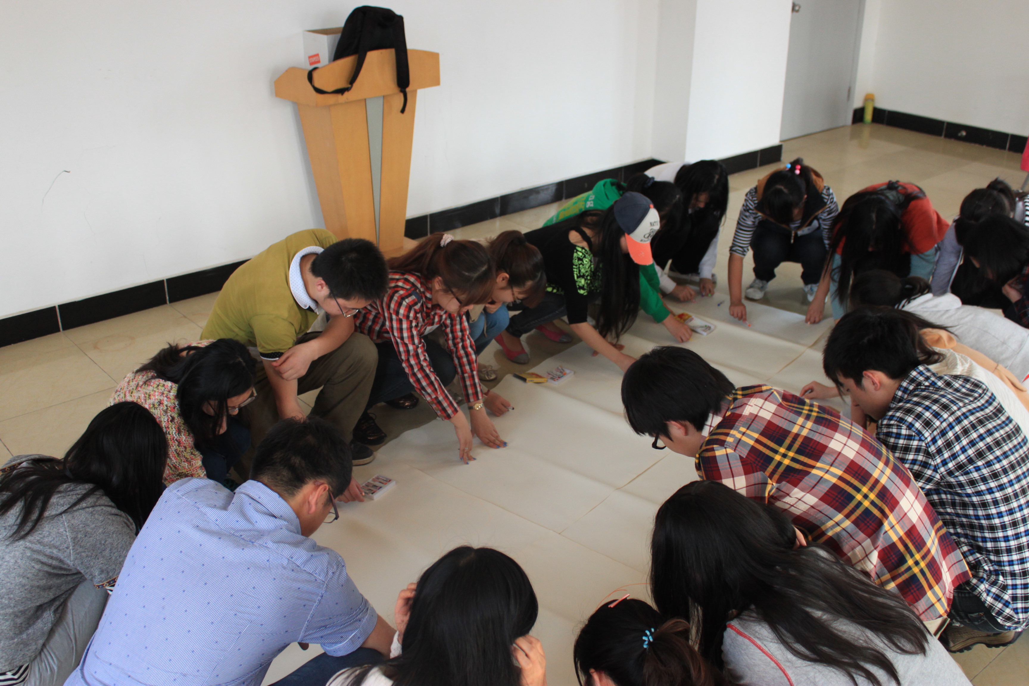 活动一开始,为建立同伴之间的信任,促进彼此交流。江娥老师首先带领我们进行了 “我的心情纱巾”游戏。活动中,成员选择最钟爱的纱巾颜色,来反映各自心情状态。这使得同伴之间得到了初步的认识与了解。接着,我们进行了抢座位的“大风吹”素质拓展游戏,这调动了现场气氛,成员们积极参与,彼此了解逐步加深。 热身游戏结束,我们进行了以支配与被支配为主题的“牵线木偶”素质拓展。在这一过程中,成员结合生活和工作实际,互相分享从游戏中带来的启示。其中一位同学说到,在上级指令一层一层传达到基层的过程中,若直属上级指令不明确,易造成下级工作混乱。其他成员也得到“牵一发而动全身”的启示。为加深彼此认识,使成员认清自我,我们接着开展了“你演我说”和“童话故事扮演”游戏。其中,在“童话故事扮演”游戏中,江娥老师积极引导我们,游戏可以反映个人性格与做事方法,是实际生活的映射。游戏中我们的行为方法往往暗示了生活中我们的处事方法。就此,成员生活实际相结合,各抒己见,认清自己在任务中的作用。在互相提点和自我反省中,成员对自己有了更深入的了解。