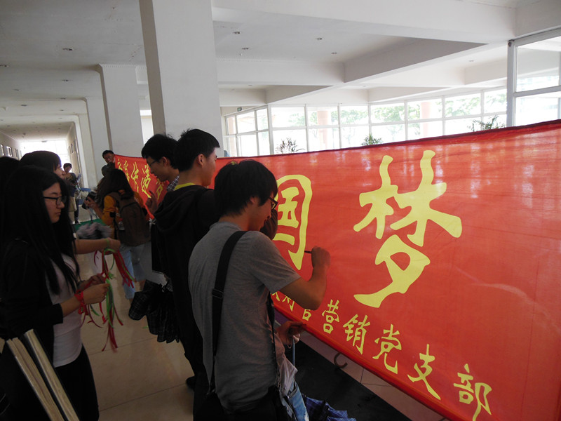 2013年5月17日,中午11点10分,10级财管营销党支部全体成员开展了“为爱传递梦想”党支部中国梦主题活动。 2012年11月29日,中共中央总书记习近平带领新一届中央领导集体参观中国国家博物馆“复兴之路”展览现场。习主席定义了“中国梦”--实现伟大复兴就是中华民族近代以来最伟大梦想,而且满怀信心地表示这个梦想“一定能实现”。 人生如船,梦想是帆,每个人都有一个只属于自己的梦,但我们同属于一个国家,只有每个人的一般梦想都有实现的可能,比如幸福,健康等,这样这个国家才能富强。这个国家富强了,我们的生活、梦想才能更美好,所以每个人的梦又与国家民族兴衰荣辱紧密相连。作为学生党员,10级财管营销支部,在肉番 校园内开展了“为爱传递梦想”主题活动。希望让更多的同学了解中国梦,心系雅安灾区人名,并珍视自己的梦想,为中华民族的伟大复兴而努力奋斗。