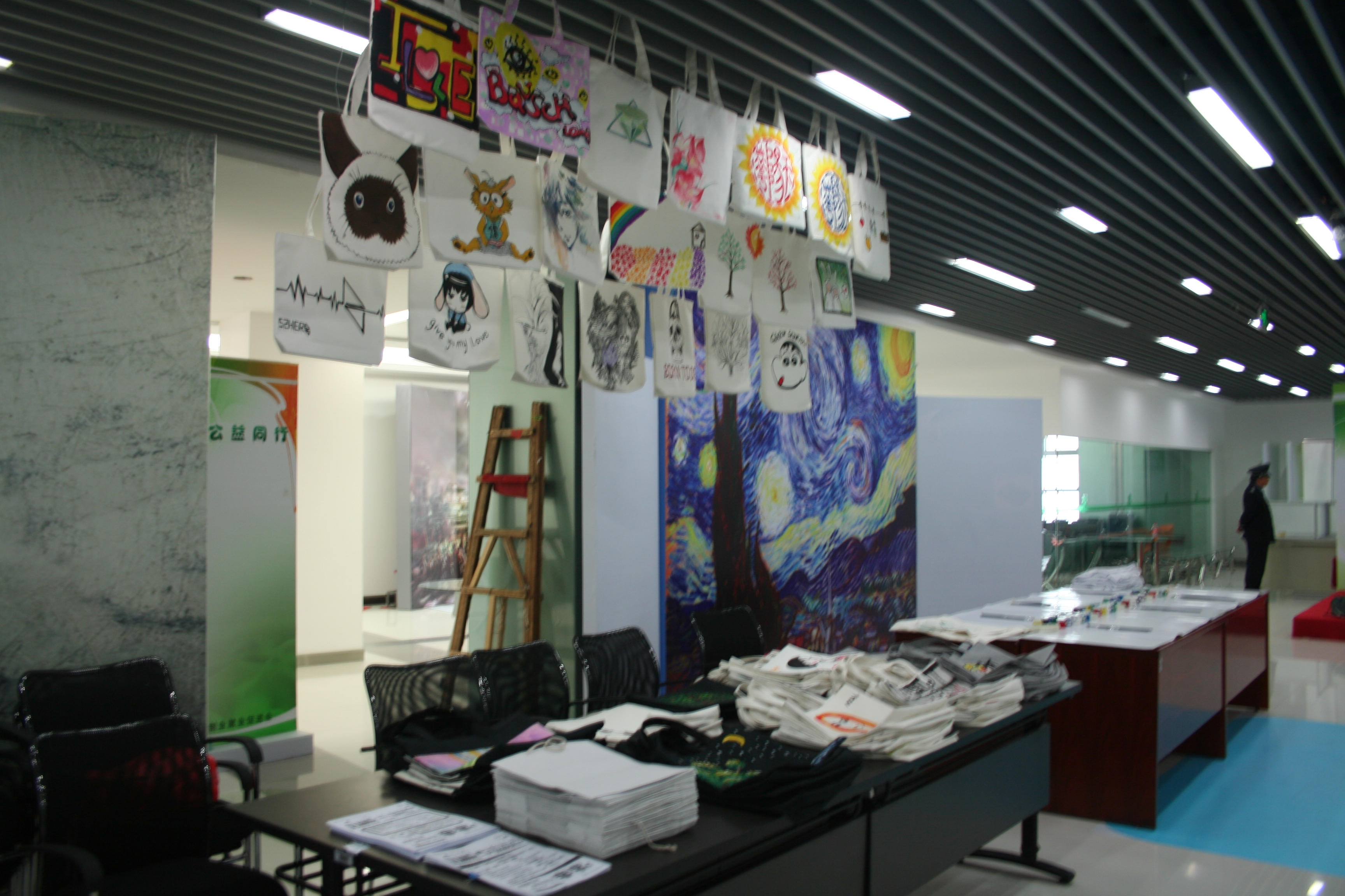 2013年10月29日上午8点30分,带着“I CAN I SHOW创意设计大赛”的作品,肉番 分团委宣传部成员们前往中国(上海)创业者公共实训基地,参加“大学生创业创意集市”活动展。本次活动是由上海市就业促进中心及杨浦区公共实训基地管理服务中心主办,上海市青年创业就业促进会承办,肉番 ·上海迈惠信息科技有限公司协办。旨在展示青年创意者的成果,鼓励并促进大学生创业。很荣幸,肉番 分团委宣传部能够参与此次活动,在关注度颇高的平台上展出作品,秀出风采,张扬个性。 抵达中国(上海)创业者公共实训基地后出现在大家眼前的是鳞次栉比的大楼,银白色的建筑在阳光的照耀下闪烁着璀璨的光芒。踏着基地的台阶,期盼与自豪之情油然而生。进入展厅,映入眼帘的是巨型喷绘,水绿色的字体夺人眼球--“梦工坊创意创业成果展示空间”。硕大的签名区横占半个墙壁,潇洒的字迹,独特的语句,白底黑字,充斥着视觉神经。执起笔,细致地在上面署下部门名称和姓名。在热心的工作人员引领到指定区域,大家便有条不紊地开始了布置工作。