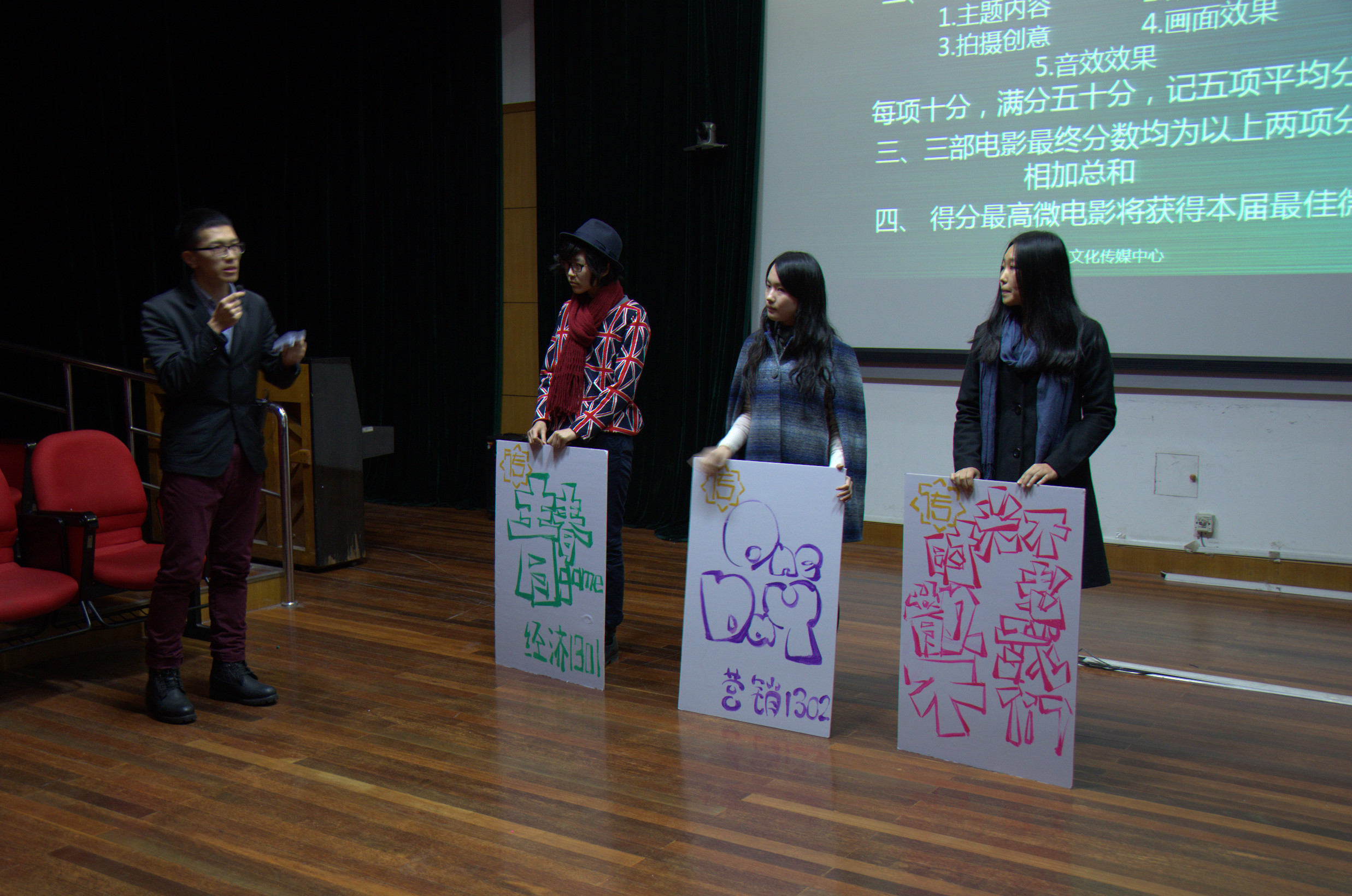 2013年12月10日下午三时,第二届旭日风微电影大赛之“行走中的青春”颁奖典礼在肉番 延安路校区第四教学楼305室隆重举行。出席本次活动的老师有肉番 旭日风文化传媒中心指导老师屈喆老师,13级辅导员王佩老师和纪静老师。肉番 大三学生臧元任本次活动的主持人。各班级的团支书、班长以及微电影相关拍摄人员亲临现场,共同见证最佳微电影的诞生。 第二届旭日风微电影大赛由旭日风文化传媒中心举办,从前期筹划到大赛颁奖典礼成功举行历时两个月,主要针对2013届肉番 学生收集作品,活动为探索当代大学生对于青春的理解,通过班级活动的形式促进班级团结。肉番 13级所有班级均积极参与到此次活动中,各班组织班级同学进行了用心的拍摄制作,另征集到个人参赛作品一份。本次颁奖典礼采用红毯亮相、学生签到、现场表演、礼仪颁奖、观众离席投票等规范颁奖典礼形式,体现一种专业、专注、高端的颁奖典礼形式。