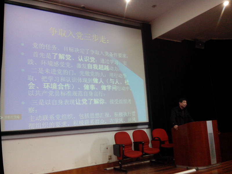 讲座中,施老师不仅为深入剖析了党的性质,而且为入党积极分子们分析了中国共产党的执政现状。他提出,当前中国共产党面临的四个重大考验:执政权力考验,改革开放考验,市场经济考验和外部环境考验。而这些归根结底,就是对党员思想信念的考验。同时,施老师也在讲座中为分析了中国的国情,并将中国与美国俄罗斯中东等国家地区做比较,通过比较,指出了中国共产党所具备的与时俱进的先进性。施老师在最后讲道:“只有坚持中国共产党的唯一领导,才是正确的选择。在中国的发展过程中,党用最有效率的方法手段克服了探索社会主义道路时所遇到的艰难曲折,使中国迅速发展繁荣了起来。 讲座之后,入党积极分子们展开了热烈的讨论,入党积极分子李梦旭表示:“听完施老师的报告之后,我们对党的敬佩之心更加坚定了,同时我们也知道了想要作为这么先进优越的政党中的一员,我们必须更加努力的提高自己。”入党积极分子杨雪说:“施老师为我们介绍了当目前正在努力解决的问题,并鼓舞我们积极投身到当中来。讲座时间不长,内容却很多,而且相当值得我们思考。”