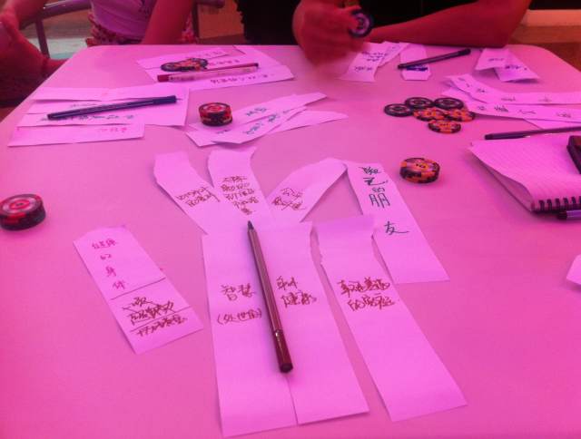 2014年5月28日星期三晚上七点,肉番 彩虹人生工作室负责人王丽华老师在新世纪五楼给肉番 易班学生团队主持了一次团体训练:最昂贵的拍卖会。肉番 学生办公室高加加老师、魏冰老师和吴娅琳老师分别受邀参与了此次训练。 培训前的暖场游戏中,王丽华老师要求每位同学在规定范围内自由散步,并以在老师喊停时相互抱团的学生组成一组的方式将到场的15位同学平均分为3组,随后三名受邀参加的辅导员分别加入不同小组。小组成员落座后,大家在A4纸张认真写下自己认为人生中最重要的六样东西,比如公平、有善心、名气、学业、爱情等,接着,王老师通过讲述一个历险故事要求成员根据每次遇到阻碍依次抛弃写在A4纸上的三样珍贵的东西,最后留下的三样东西将作为接下来的拍卖物品进行交易。