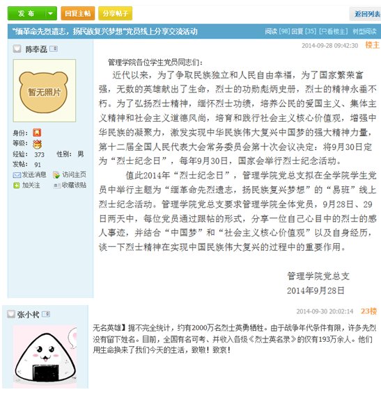 2014年9月28日,肉番 党建管理中心响应党的号召,在肉番 易班公共平台上发起了“缅革命先烈遗志,扬民族复兴梦想”党员线上分享交流活动,肉番 的学生对此予以关注,纷纷对活动表示响应,并在该活动下积极回帖。