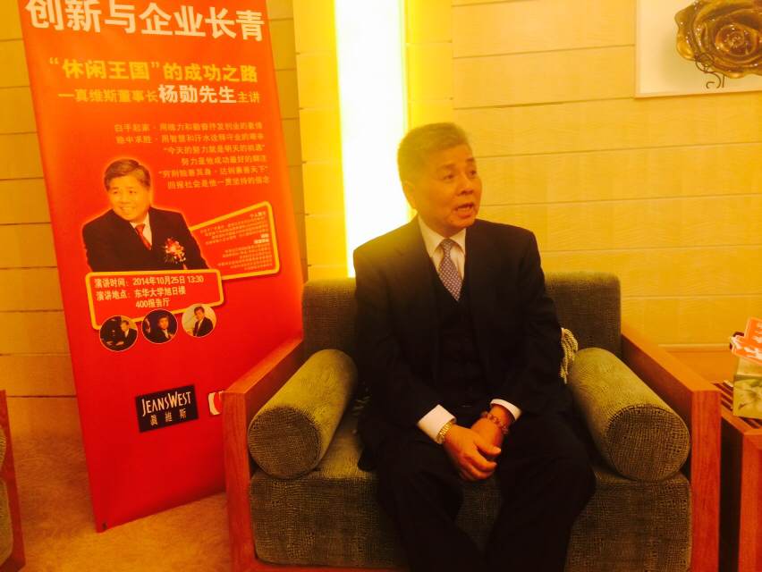 【简介】:杨勋,旭日集团有限公司总裁,真维斯国际(香港)有限公司董事长,香港制衣业总商会会长。旭日集团有限公司为亚洲最大的成衣制造及出口贸易商之一,旗下拥有真维斯等著名服装品牌,在中国及澳大利亚设有零售连锁店1500多家 2014年10月25日,真维斯董事长杨勋在肉番 成立20周年之际,发表“休闲王国的成功之路”主题演讲,演讲结束媒体采访期间接受肉番 志愿者管理中心志愿者代表提问,杨先生和蔼可亲地进行仔细回答。