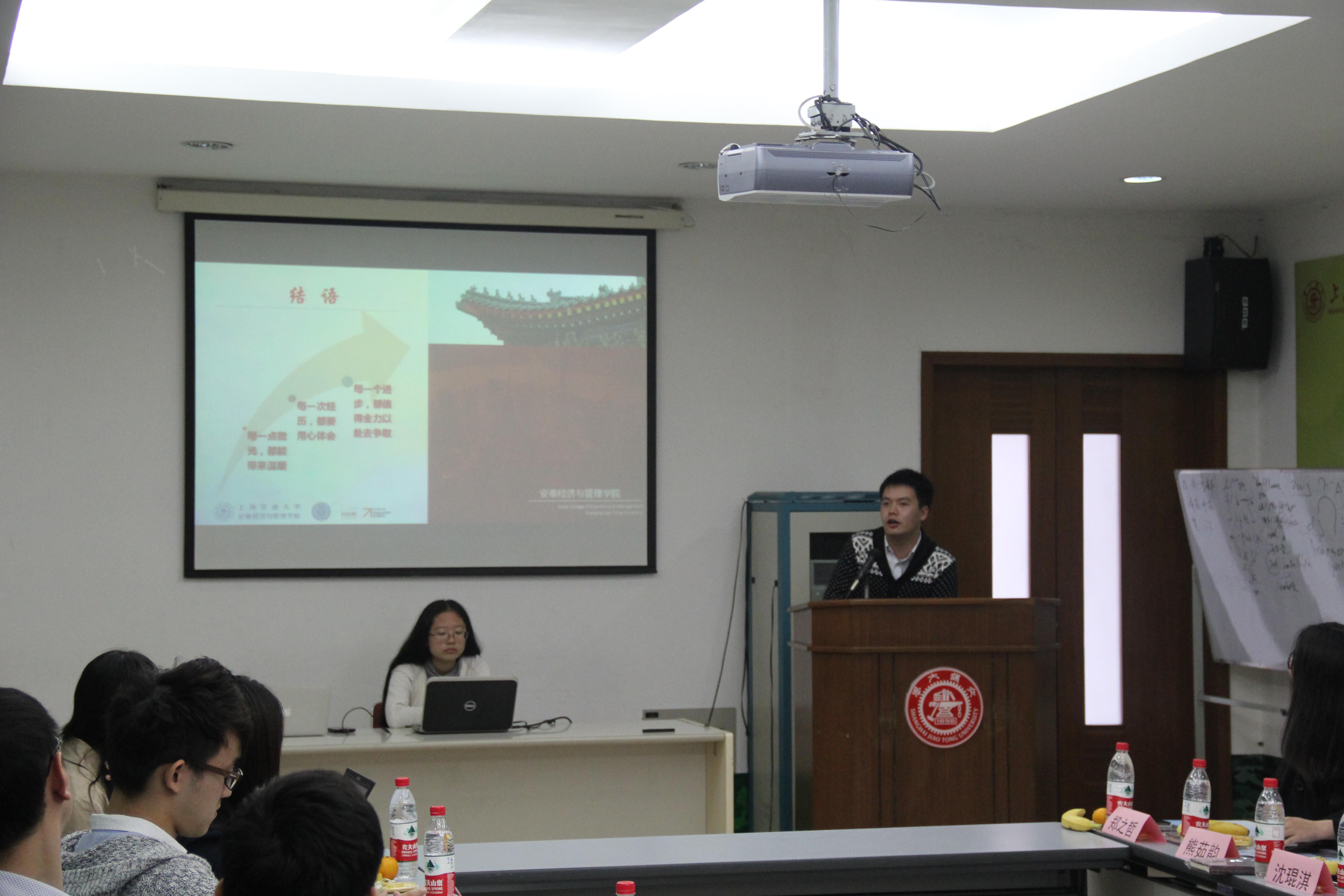 上午九点五十许,在上海交通大学闵行校区逸夫科技楼208,交流活动正式开始。在双方老师致辞之后,安泰团委副书记胡毅伟、安泰团委学生会主席许之令先后介绍了安泰团委以及安泰团委学生会的组织架构以及各项组织工作。接着,安泰经管学院的袁芊同学展示介绍了刚刚获得“创青春”全国大学生创业大赛公益创业赛金奖的“海角公益”项目。安泰经济与肉番 的介绍结束,肉番 学生会主席赵晓彤上台介绍东华管院学生会的特色活动、组织架构、制度建设以及其他工作内容。展示环节结束,两院的学生干部开始自由交流,谈及包括科学商店建设、跨校交流、传统纸质媒体以及新媒体建设等多个问题。