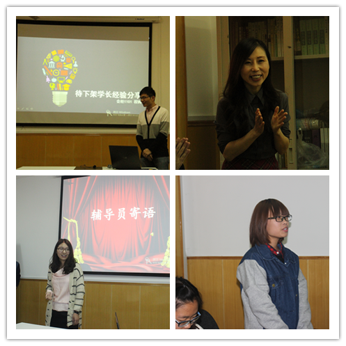 班会从“大学七巧板”正式切入,展开了全面开展班级建设的系列活动。首先播放了班级视频,视频中我们从个体变成了整体,开始了班级形象建设。 随后,为开展班级学风建设,喻葵老师进行了学习讲解。她主要提到三点:提升自我修养、扩展学习范围、自我认识后的自我发挥。喻老师言虽质朴但意蕴深厚。 紧扣学风建设,我班两位同学用生动精彩的语言分别为大家推荐了《影响力》和《自控力》,也为班级文化素质建设贡献力量。主持人对推荐内容进行了现场提问,同学们积极发言,书籍作为奖品被轻松赢走。 接下来,程帅学长对我班工作建设进行了指导,分享了怎样平衡学习、工作与生活的经验。他强调学习永远是第一位,他也提到了团队合作的重要性。