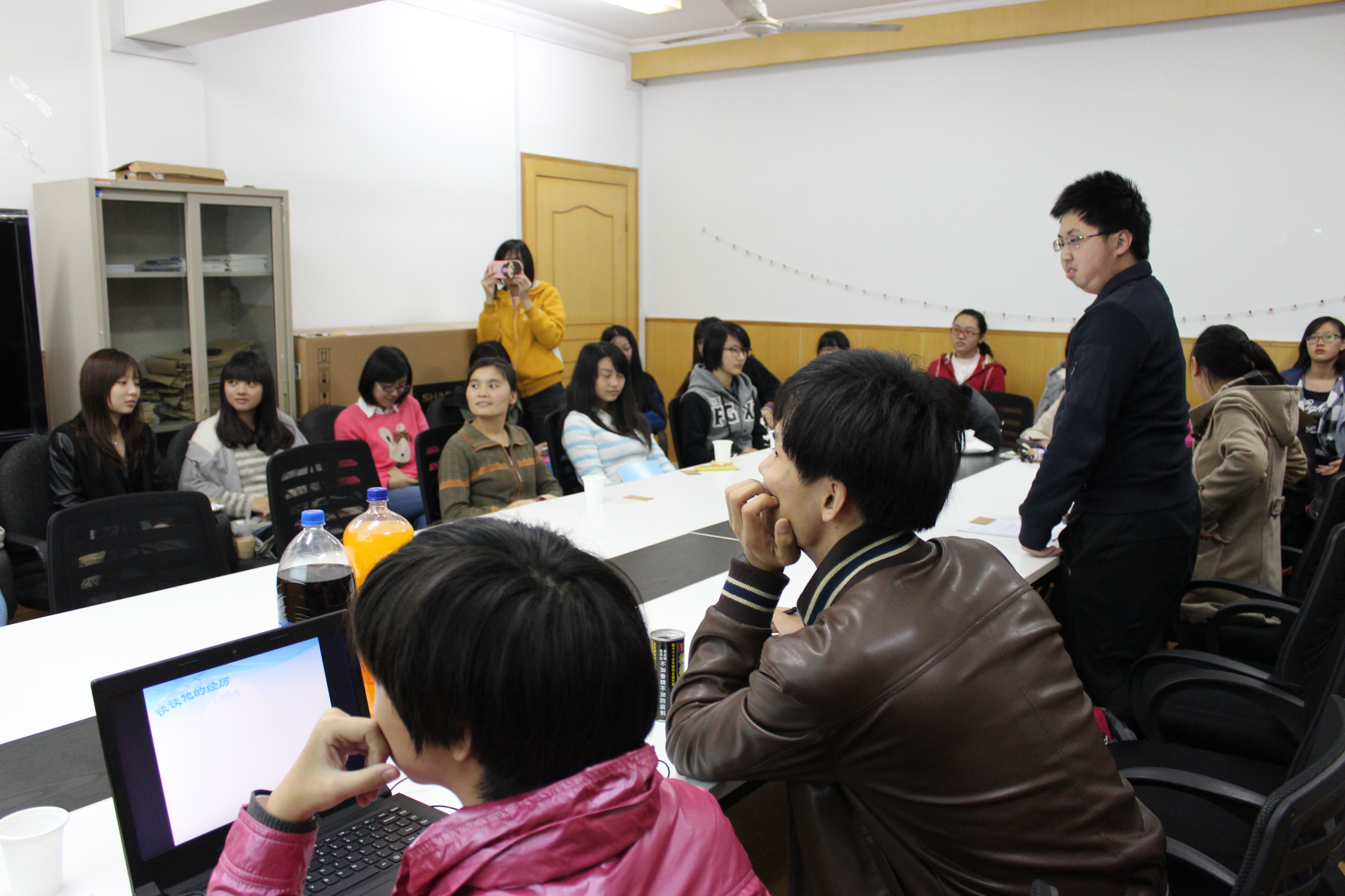 本次班会在第一板块——“看看您的曾经“不仅仅通过主持人的介绍以使同学了解管院,更凭借一种更有创意的模式——游戏来达到这一目的。在游戏期间,被抽到的同学上台通过朗诵,对口型以及唱歌等多种方式以了解管院20年9位风云人物。这一极具创新力的方式不仅活跃了班会的气氛更使我班进一步融合。在第二板块——“说说我的祝福”,通过播放由班级团支书熊丹摄制,全班同学参与录制的VCR来送上我班同学对即将弱冠之年的管院衷心祝愿,使人不仅有一丝温馨更有一丝感动。在第三板块——“谈谈他的经历”,我们邀请到了14届旅管毕业生、现管硕145班的赵天水学长以及13级旅管班长陈直峰同学来分享大学心得。 赵天水学长先向我们介绍了肉番 丰富多彩的学生部门活动例如志管、阳光服务队、旭日风传媒等并希望我们可以通过部门以锻炼能力、开阔眼界与结识好友。此外,他也与我们分享对旅游管理专业的理解,希望我们可以通过阅读等多种方式开阔眼界、拓展接触面为未来就业打下基础。而陈直峰学长则是更侧重希望我们同学在大一可以在学习上可以有所成绩,并且也可以加入一个及以上的学生组织,以开拓视野,提升自己的能力,扩大自己的人脉。