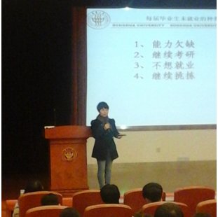 2014年11月11日下午13:00,《专题讲座:考研出国就业,毕业季的路怎么选?——记金融物流专场》在肉番 延安路校区旭日楼400室盛大举行,此次讲座由彩虹人生工作室王丽华老师主讲,主要面对即将进入大四的东华学子,目的在于使大三学子明确未来人生的发展方向,早日抉择就业,出国抑或考研的道路,为即将步入大四却对未来道路充满迷茫的学子指点迷津。 对于一名大学生,在面对毕业季时无非有三条路可走:就业,出国,考研。然而这三条道路每一条都非畅通无阻。就业:大学毕业生正面临史上最难就业季;出国:大学生则要面对文化语言等各方面的差异;考研:大学生需要花费大量时间为考试做准备,同时面对考研失败的威胁。此次讲座,王丽华老师针对这三条道路一一为大三学子解答疑惑,旨在帮助学子明确未来方向,进而激发学子面对未来的自信与激情,为未来而战。 首先,王老师以简洁朴实的语言开始此次讲座,并简单阐述大学生未来发展的方向。然后王老师开始此次讲座的第一大方面-----就业。王老师先以明晰具体的数据展示出近几年肉番 生留沪比例,并分析数据指出近年来大学生留沪比例逐年下降,而返乡就业的比例逐年上升,同时指出返乡就业大学生更占优势。紧接着陈列出肉番 学生各行业分布及就业人数所占比例。然后,对各单位性质进行分析,指出国企深受大学生欢迎,同时以一学生趣例告诫大三学子就业未必在大企业中才有出路,有时候避大就小也可以弯道超车。最后,又以自身参与的大学生招聘以及一些大学生失败的就业原因勉励大三学子在平时要注重培养社会交际等各方面的能力。