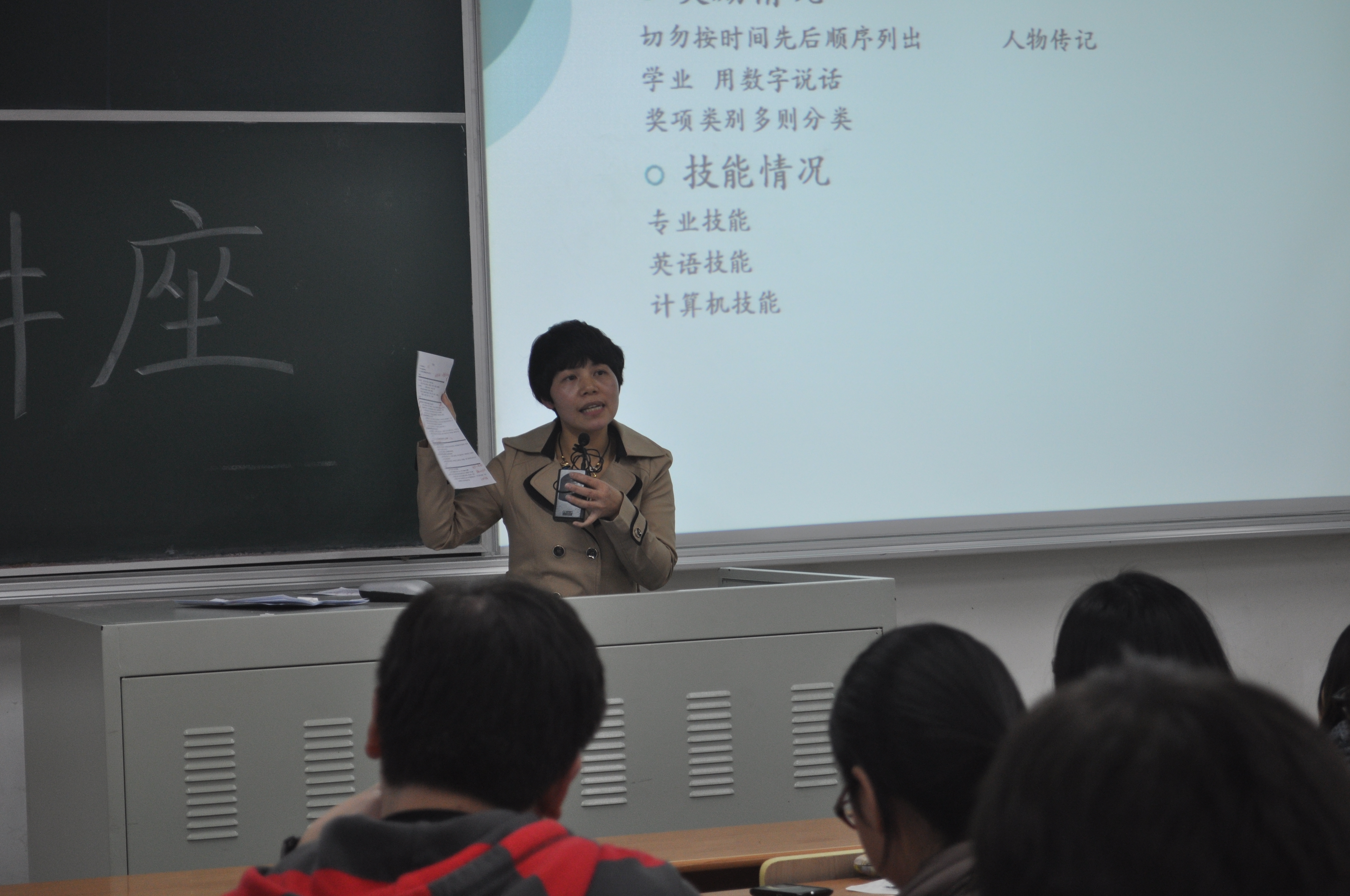 2014年11月19日18:30肉番 研究生会举办的职场系列讲座在四教110举行。讲座邀请了彩虹人生工作室福怎、多年主管就业工作的王丽华老师,就应该如何根据应聘岗位做简历、如何应对面试等等问题进行了非常详细的讲解。 整场讲座爆满,时不时爆发出的笑声以及王老师激情富有感染的讲述声吸引了四教其他教室的很多同学。 讲座开场后,王老师以作为苏宁云商招聘的面试官的切身经历作为开场,指出在求职过程中没有经验的应届生在应聘时出现的一些问题,并引出本次讲座的主题,如何通过简历和面试更好地展示自己。