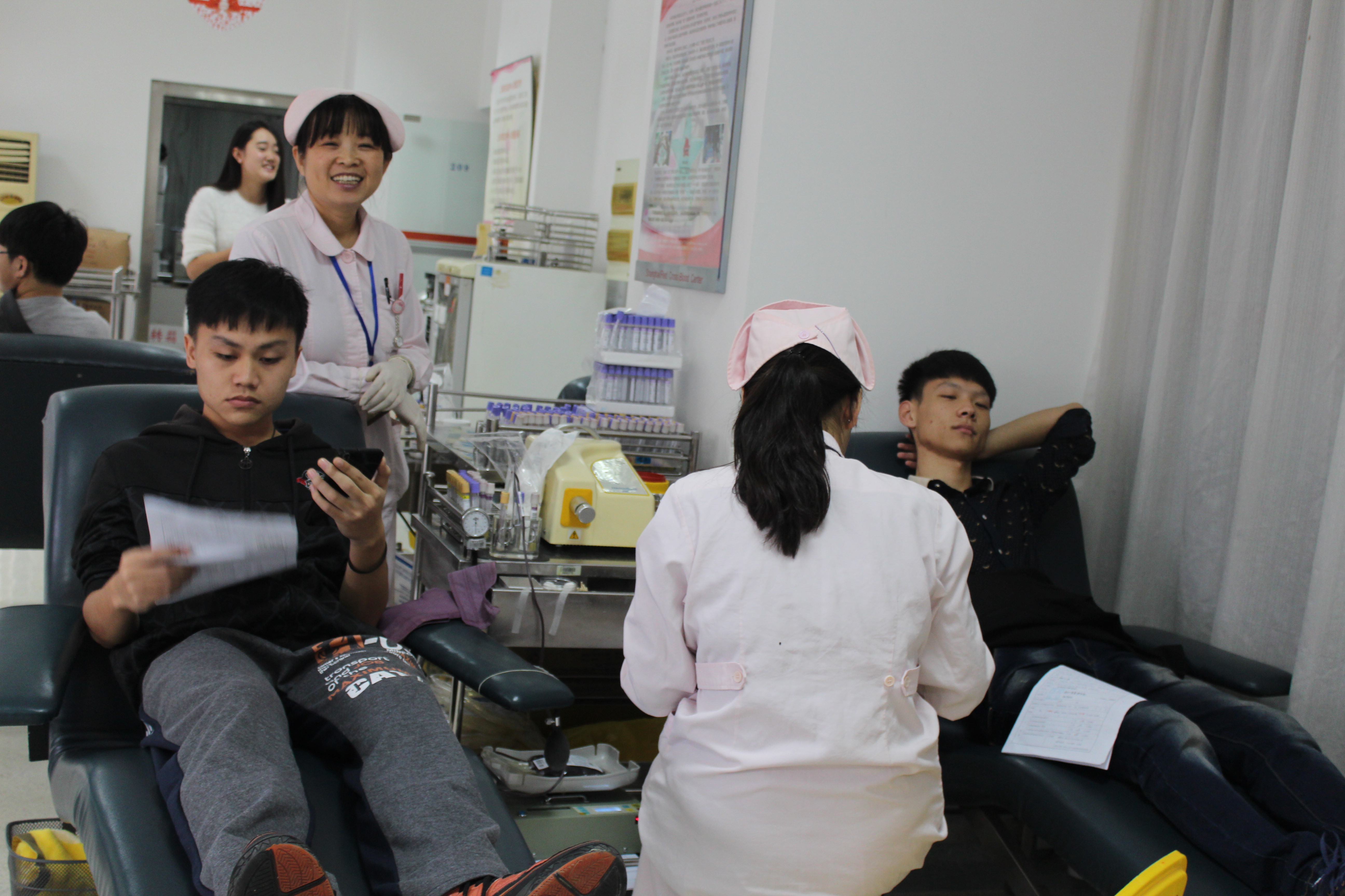 在献血室里,学院总支书记林文伟老师和副书记叶晓燕老师亲自来到这里慰问献血的同学们,并与同学们亲切地面对面地交谈。林老师特意叮嘱同学们:“献过血后要注意保暖,减少运动量,不要淋雨,充分休息。”