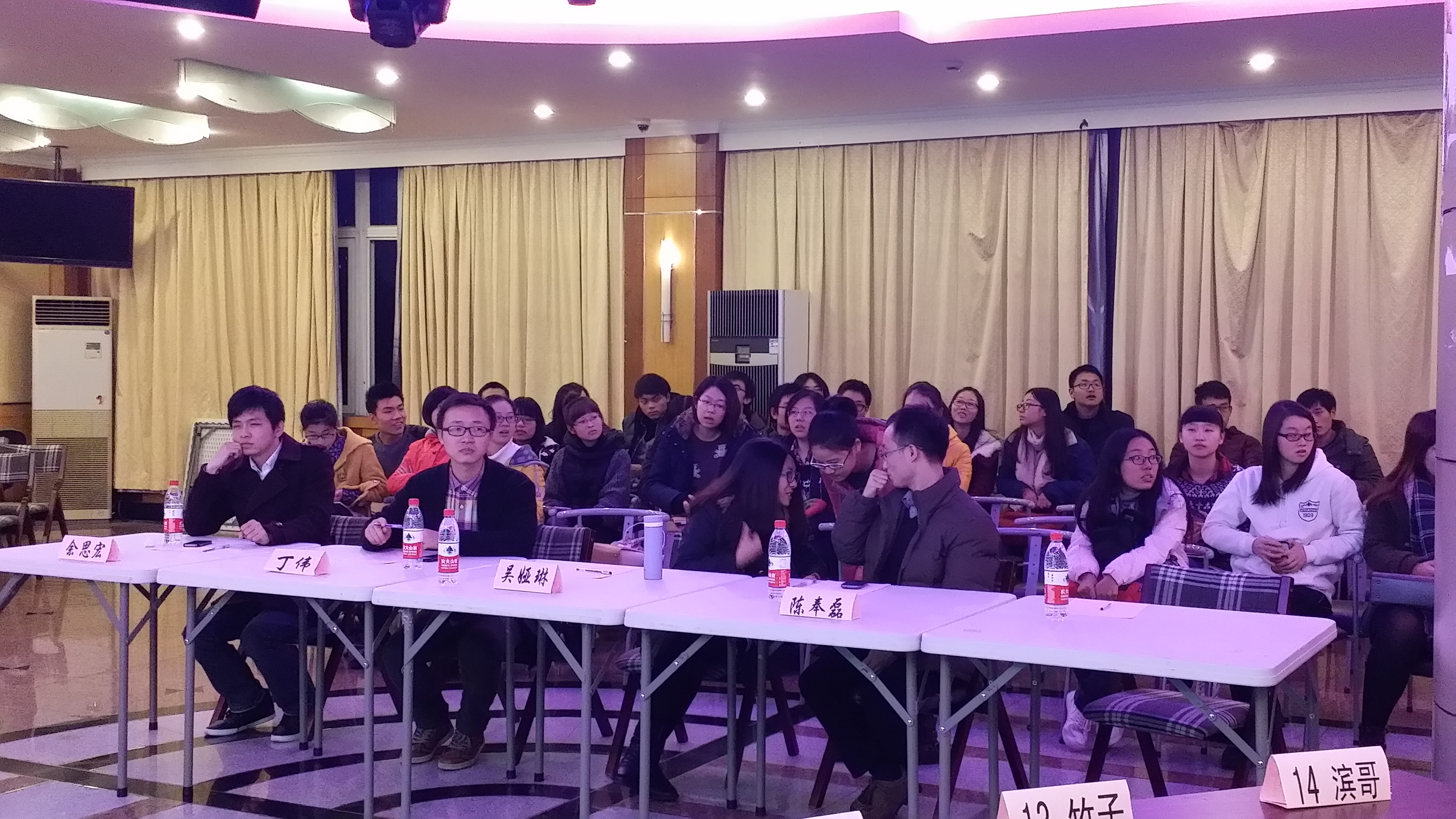 参赛选手结与前来的观众为两个支部的党员、积极分子以及递交入党申请书同学。评委老师有:肉番 党校指导老师陈奉磊;管理学经济第二学生党支部书记吴娅琳老师;管科学生党支部书记丁伟老师以及14级年级组长余思宏老师。