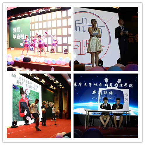 小品《东华管院新闻联播》用幽默搞笑的形式回顾了大学四年生活的点滴乐趣与感悟。光影秀是此次毕业晚会最为独特的一个节目,演出的同学用自制道具,在灯光的配合下,从白色的幕布后面告诉了大家一个有关大学爱情的美好故事。 除了学生们的精彩表演,学生工作办公室的辅导员们也参加了演出,他们与学生们的歌曲联唱,展现了大学生活中师生之间的深厚情谊。联唱后,老师们的殷切寄语表达了他们对于同学们的依依不舍及深深祝福。