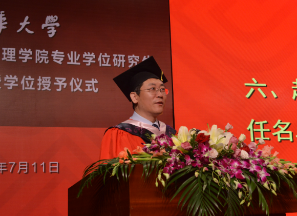 邱高副校长向毕业生们致辞。邱校长代表学校党政领导向各位毕业生表示最真诚和最热烈的祝贺!在分享喜悦的同时,他期望同学们更要在这个历史的关键点上,学以致用,不断提升自己的人格魅力和修养,力争大气为人,做一个睿智的管理者。