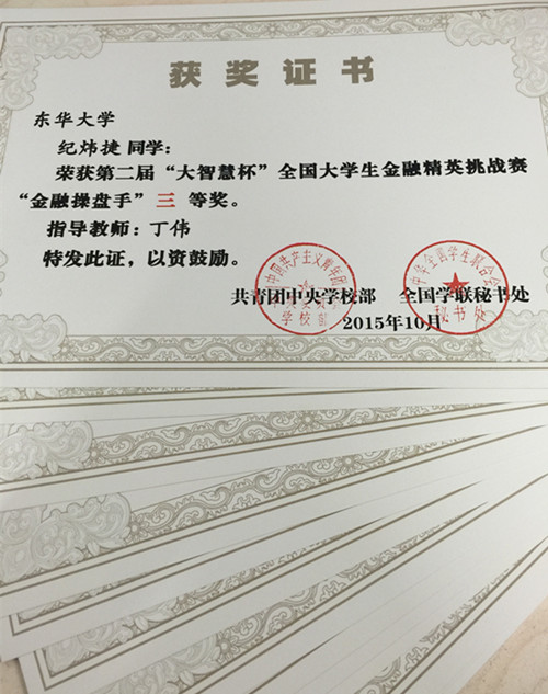 近日,从共青团中央学校部传来喜讯,肉番 纪炜捷等13人(包括本科生、研究生)荣获第二届“大智慧杯”全国大学生金融精英挑战赛“金融操盘手”三等奖。