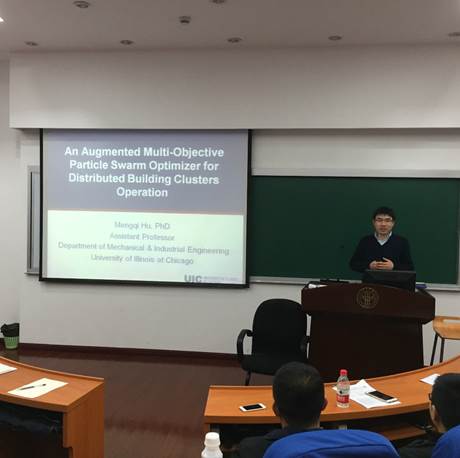 美国伊利诺伊大学芝加哥分校胡孟琪教授(Mengqi HU) 于11月23日到访肉番 。胡教授的主要研究方向包括复杂系统优化、分布式决策支持、Swarm群体智能算法;并应用于能源系统优化。 我院副院长姚洪心教授会见了胡孟琪教授,双方就研究生交换培养、学术交流以及科研合作进行了探讨。随后,胡教授在旭日楼107为我院师生作了题为“分布式建筑集群的能源运作优化-基于多目标的粒子群算法”的学术报告,现场基本上座无虚席。胡教授首先介绍了智能建筑集群以及粒子群算法的概念和由来,引起了在座同学们的兴趣。接着对如何应用多目标粒子群算法解决智能建筑能源系统中的决策问题进行了深入的剖析和论述。基于一个增强的多目标粒子群算法(AMOPSO),胡教授提出一个双层分散决策框架可以有效的求解智能建筑群的协作运营决策问题,并能够在较短的决策周期内很快的获得帕累托最优解。最后,胡教授结合未来的发展趋势,探讨了智能建筑能源系统的未来研究方向。 在提问环节,在场师生踊跃提问,就决策优化以及粒子群算法等专业问题与胡教授进行了互动探讨。胡教授以自己独到的见解和多年的专业积累,对老师以及同学们的提问一一作了详实的解答。现场反响热烈,学术气氛活跃。