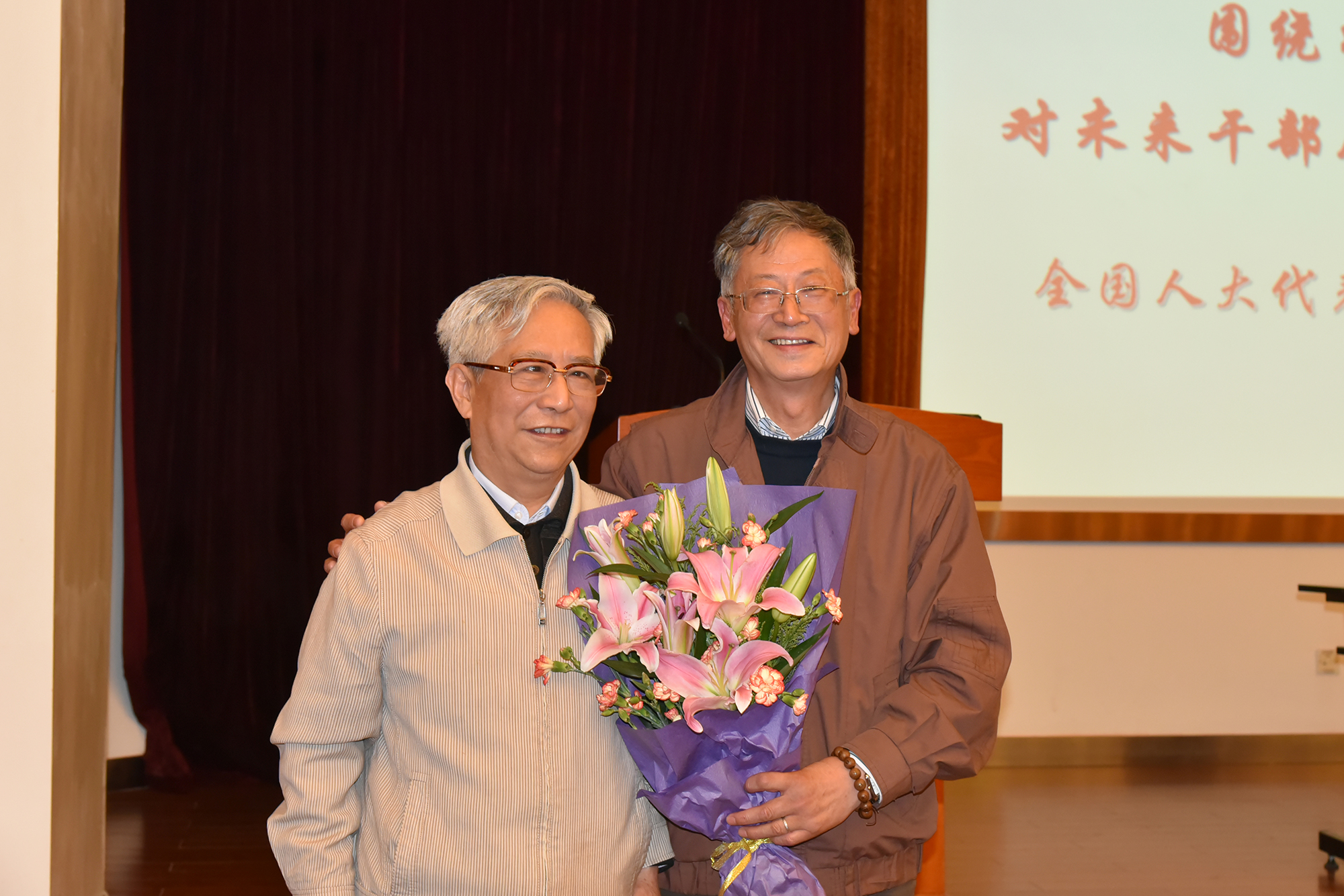 严老师的讲话一结束,嘉宾戴昌钧教授就站了起来将手中的鲜花献给严老师,严老师感人真挚地拥抱了戴教授,说起了和戴教授前辈之间的“革命情谊”。 听完了严老师的人生感悟,工作人员在易班的留言板上挑选出了几个具有代表性的问题请严老师来给大家解答困惑。严老师的解答饱含智慧,引人深思,现场的学生代表上台给严老师献上了表示谢意的鲜花。