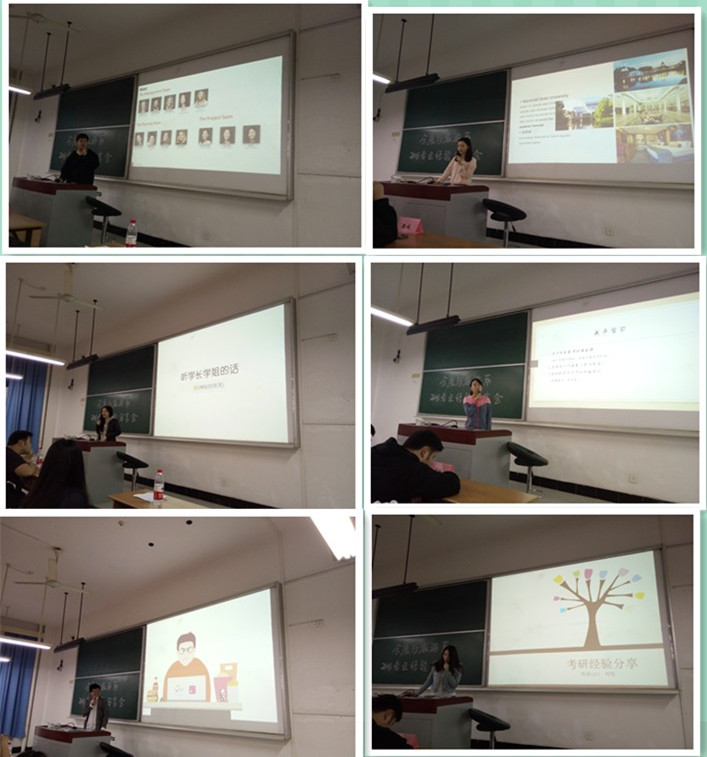 然后,选择国内外升学的2016届毕业生学姐们也给大家做了简要分享。何艳学姐拥有与众不同的大学生涯,她从一个“没长大的贪玩孩子”到勇敢参军磨练,再到无畏追梦,最终圆梦复旦,其中的不易令人赞叹。对于考研,她有的放矢地选取关键信息点给与大家指导,比如如何决定方向和目标,如何制定复习计划、把握时间等。她鼓励大家把心态放平,用努力去成就自己。韩亚男学姐已经被报送至本校研究生,她十分细致的给大家讲解了保研的政策,并结合自身经历,提出一些非常实用的建议,让向往保研的同学有了更清晰的努力方向。伍芮莹学姐即将前往瑞士理诺士国际酒店肉番