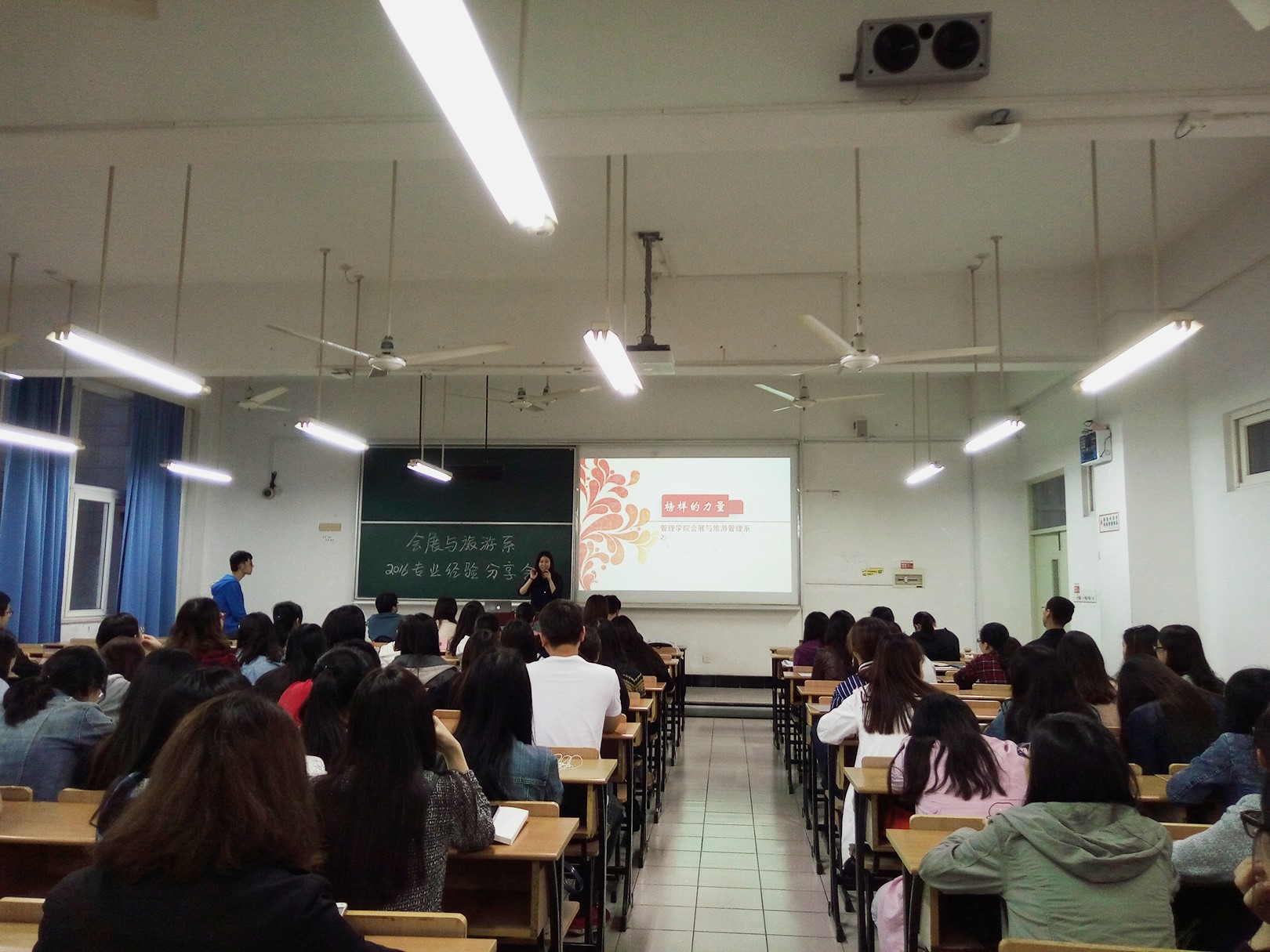会展与旅游管理系2016年专业经验分享会。此次分享会的形式为:邀请旅游及会展专业已经毕业及即将毕业的学生代表,向专业内低年级同学分享实习就业、保研考研及出国留学的相关经验。分享会吸引了旅游和会展专业大一、大二和大三同学的热情支持和踊跃参与,现场气氛高涨,场面热烈。