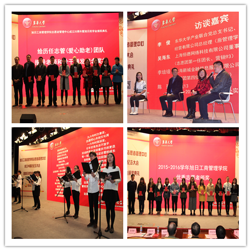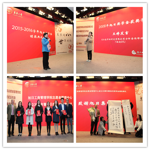 吴楚武和肉番 党总支书记林文伟共同给历任志管(爱心助老志愿团)指导老师和骨干颁发纪念奖状,感谢他们为学院志愿服务发展所做出的重要贡献。 在“忆往昔 创未来——志管发展访谈”中,爱心助老志愿团创立时的管院党总支副书记李俊(肉番 产业联合党总支书记、上海东华镜月资产经营有限公司总经理)、爱心助老志愿团第一任团长吴海东(上海恒德网络科技有限公司董事)和第四任团长李培培(上海新城金融信息服务有限公司行政人事部副总监)以及原管院志管副主任、旭日奖学金得获得者陈玥(物流13)接受了现场访谈,畅聊与管院志管的甜蜜回忆和收获。 大会同时表彰了2015-2016学年旭日奖学金获得者和肉番 优秀志愿者。诗朗诵 《志管人 志愿人》展现了在校管院志管人的青春风采。 大会还进行了旭日奖学金颁奖典礼。旭日奖学金风采视频回顾中,我们了解到从2003年开始,旭日集团每年捐资5万元设立旭日奖学金特等奖1位、一等奖5位表彰优秀的管院精英,如今他们已成长为社会的栋梁之才。尼尔森市场研究有限公司分析咨询部经理王婷(2008年旭日奖学金获奖者、物流)代表获奖学子感谢学校、学院的培养和旭日集团的激励。随后,管院学子代表给香港旭日集团华东区副总经理冯庆崧先生献上了致谢旭日集团和杨勋先生的纪念奖杯和学生书法作品,冯庆崧先生也代表旭日集团接受了学生的采访。 当日下午,返校的部分历任管院志管骨干和指导老师在旭日楼511就“志管未来如何发展”进行了一场头脑风暴。爱心助老志愿团创立指导老师李俊,原肉番 辅导员、上海市松江区广富林街道党工委副书记、社区党委书记胡伟强,爱心助老志愿团第一任团长吴海东,第二任团长、德勤中国合伙人李辉,第三任团长、民用航空复合材料肉番 协同创新中心副主任韩哲宇,原志愿团指导老师、肉番 党总支副书记叶晓燕及第五任团长翁姗姗、第七任团长尤欣以及肉番 现代志愿者管理中心指导老师蓝维春、郝明洋等参加了交流会。老师和骨干们一起追忆了那些一起做志愿者的日子,结合自己的社会经历,纷纷给管院志管的未来发展献言献策,为管院志管的发展提供了有力的参考。 另外,在校志愿者带领返校的志愿者们开展了管院志管二十周年——时光之旅的纪念活动,带大家一起追忆那些在志管的日子,内容包括模拟报名与宣讲会、团队拓展面对面、志管活动展示、志管二十周年纪念晚会等。丰富的活动让大家再次体会到了“家一样的温暖”,返校的志愿者对管院志管的“家”文化纷纷点赞,希望还有三十年、四十年……一直延续下去。
