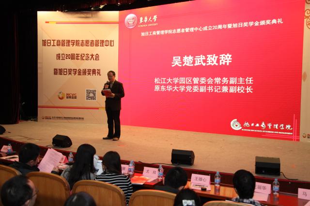 会上,松江大学园区管委会常务副主任、原肉番 党委副书记兼副校长吴楚武致辞。吴楚武在致辞中生动地再现了当年他作为校党委副书记与爱心助老志愿团结下的深厚情缘。他提到,爱心助老志愿团是在上海老龄委支持下的上海市第一家爱心助老志愿团,是当年“上海市教育系统精神文明建设好事”。他于1998为爱心助老志愿团题词“夕阳中飘扬一面年轻的旗帜”,至今他还保留着当年与志愿团骨干接受上海东方广播电台采访的录音。二十年来,爱心助老志愿团不断发展壮大为肉番 志愿者管理中心,志愿精神在一代代管院人中传递。他对管院志管20年来在志愿者管理与人才培养上取得的突出成绩给予高度赞扬,特别感谢香港旭日集团及杨勋先生捐资助学、回馈社会的善举。希望管院学子能够继续秉持优良传统,再接再励,在志愿服务实践中彰显青春风采,促进全面发展。