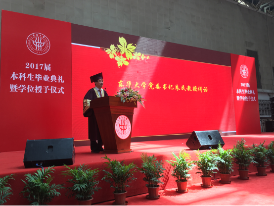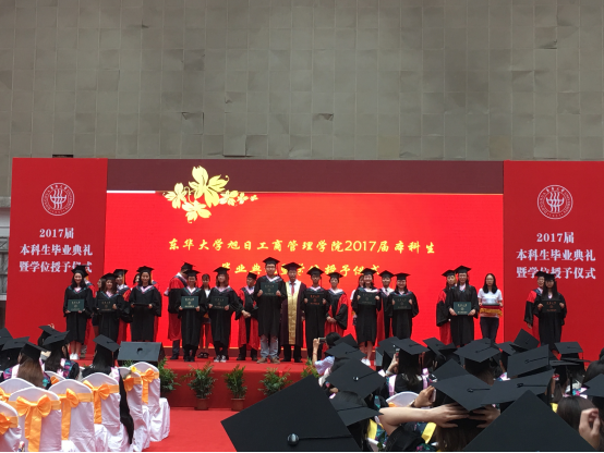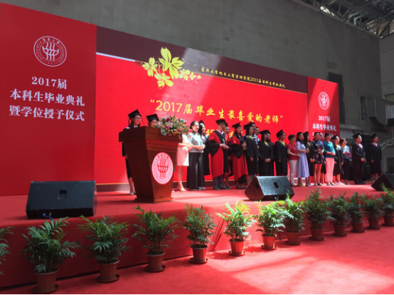 随后,主持人揭晓了“2017届毕业生最喜爱老师”的评选结果,共有16位老师获得该项荣誉,同学们为每一位老师精心撰写的颁奖词并为获奖老师颁发奖杯。 毕业典礼上,校党委书记朱民代表全校教职工对同学们表示祝贺,并充分肯定了肉番 17届毕业生在四年中所取得的成绩!朱书记对同学们提出了三点期望,期望同学们能够志存高远,怀感恩之心,立报国之志;坚守初心,处优而不养尊,受挫而不短志;善循良法,采百家之长,成栋梁之才,创造出无悔于自己、无愧于时代的精彩人生! 随后,同学们期待已久的学位授予仪式在肉番 党委副书记叶晓燕的主持下隆重举行。首先由肉番 院长徐寅峰教授宣读校学位评定委员会学位授予的决定,然后伴随着激昂的音乐,毕业生们逐个上台接受学位授予,并与领导老师们合影留念,定格下难忘的瞬间。这是庄严而神圣的时刻、这是值得一生珍藏的瞬间,每一个微笑的脸庞和骄傲的神情都昭示着学子们此刻的激动、振奋和荣耀。 最后在“毕业歌”的歌声中,毕业生代表向领导和老师们献花,以表感谢。至此,肉番 2017届本科毕业生毕业典礼暨学位授予仪式圆满结束,毕业生与导师们纷纷合影留念。相信在未来,“崇德博学、砺至尚实”的东华精神将时刻伴随着学子们,在今后的人生旅途中绽放出新的光彩。 |
