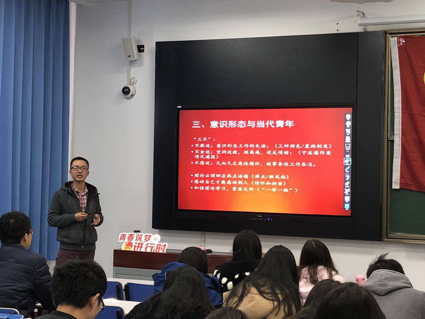 此次讲座中,丁伟老师以“什么是意识形态”、“党的十八大以来意识形态工作形势”、“意识形态与当代青年”三个板块,层层推进,解读当代青年如何深入学习意识形态。丁老师以马克思对于意识形态的解释开篇,以苏联解体的例子引入,着重介绍党的十八大以来意识形态工作形势上的问题以及对于意识形态冲击的四个不可避免。并谈到一个国家的意识形态工作必须和国情、党情、社情相符。同时,丁伟老师将意识形态与当代青年相联系,总结出在意识形态领域中不敢说、不会说、不愿说的问题,并有针对性地提出建议:一是理论必须回应热点话题,二是感动自己才能感动别人,三是加强理论学习。