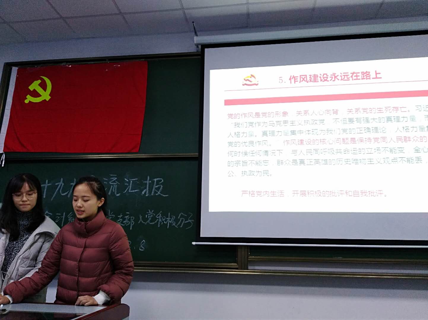 2017年12月8日晚19:30,中共肉番 会计系学生支部委员会全体入党积极分子在1教116举行了学习党的十九大会议精神的交流分享会。支部所有积极分子和支部全体委员参加交流会。 学习贯彻党的十九大会议精神是当前的首要政治任务。十九大闭幕后,会计系学生党支部积极组织入党积极分子们开展相关的学习活动,经过筹划,支部入党积极分子经过前期充分自学、后期小组讨论和深入思考,最后将小组所学、所思和心得体会进行汇报,形成相互学习、相互促进的学习氛围会计系学生党支部目前共有积极分子53名,汇报以小组代表交流,每组8分钟,共十组,通过PPT演示将小组学习情况进行了汇报。有的小组将对十九大报告、党章的修改和习近平新时代中国特色主义思想等方面的学习感受进行了汇报交流。也有小组从“文化自信”、“四个意识”、“从严治党”等为切入点展开学习汇报。其中,杨佳仪代表小组进行交流汇报给人印象深刻,她举了大量的实例,让学员们深刻地体会到党章的内容与大学生日常生活密切相关。能将十九大报告的新思想、新观点很好地与大学生生活点滴相结合,解读十九大精神非常值得学习。习近平新时代中国特色社会主义思想也是各小组汇报最多的,说明当代大学生对于党的最新理论成果非常关注,牢固树立了“政治意识、大局意识、核心意识和看齐意识”。有小组能够结合大学生的具体情况,提出应该“行在当下”,在勤奋学习、对党忠诚、遵规守纪上做好表率,引起了大家的共鸣与反思。叶阳天代表谈到了真人版电影《花木兰》翻拍选人、我校民乐团赴肯尼亚的表演,说明弘扬中华优秀传统文化的重要意义,也提出了在坚定文化自信的过程中,如何避免走向文化自卑和文化自大等。 最后,会计系学生党支部书记徐志德老师对每组的汇报都进行深入的点评。首先,他肯定积极分子们都较好地贯彻落实了学习任务,并能结合自身实际提出了很多可行的措施。其次,他强调了学习十九大会议精神一定要落到实处,原原本本的学文本,踏踏实实去落实。学原文,勤思考,形成自己的看法,才能有更深刻的理解和认识。要结合自身、结合大学生的特点,在实践中把握理论。最后,徐老师对所有的入党积极分子提出了要求与展望。他希望每一位积极分子都能定期与自己的入党联系人汇报思想动态,积极参加支部的各项活动。在今后的学习、生活、社会实践等各个方面发动主观能动性,起到带头作用,树立“四个意识”,不断向党组织靠拢,争取早日入党。 经过两个多小时的学习与交流,入党积极分子对党的十九大会议精神有了更深的认识,尤其是中国特色社会主义进入新时代、习近平新时代中国特色社会主义思想等有了更深的理解,对党员发展的流程和标准又有了更深入的了解。有积极分子在会后说,通过本次学习交流汇报,使自己更加坚定加入中国共产党的初心,对实现中华民族伟大复兴的中国梦更有信心,表示在未来的入党甚至人生之路上都会志存高远,脚踏实地,像习近平总书记说的那样,在实现中国梦的生动实践中放飞青春梦想,在为人民利益的不懈奋斗中书写人生华章! 据悉,会计系学生党支部为了学习贯彻落实十九大会议精神,前期已经召开专题党员大会,同时组织专题学习小组,就十九大报告中关于教育、生态环境建设等展开专题学习,在理论上与党中央保持一致;开展榜样引领活动,要求支部每位党员要带头学习,观看大会视频和学习相关文件,发挥作用,带动宿舍室友、班级同学等一起学习;发挥朋辈引领作用,做好传帮带工作,对接5-6名积极分子,指导积极分子积极学习十九大精神;组织专题实践活动,以服务学生、服务学院、服务社会为宗旨,组织支部党员积极投身社会实践之中,开展形式多样的志愿服务活动。为加强党性教育,组织支部成员赴中共二大会址、龙华烈士陵园、刘长胜故居参观;为让支部更好的理解坚定文化自信,弘扬中华优秀传统文化重要意义,与易班国学苑合作进行书法研习活动等。 撰稿:徐志德、顾佳美 摄影:顾佳美、房建雅等