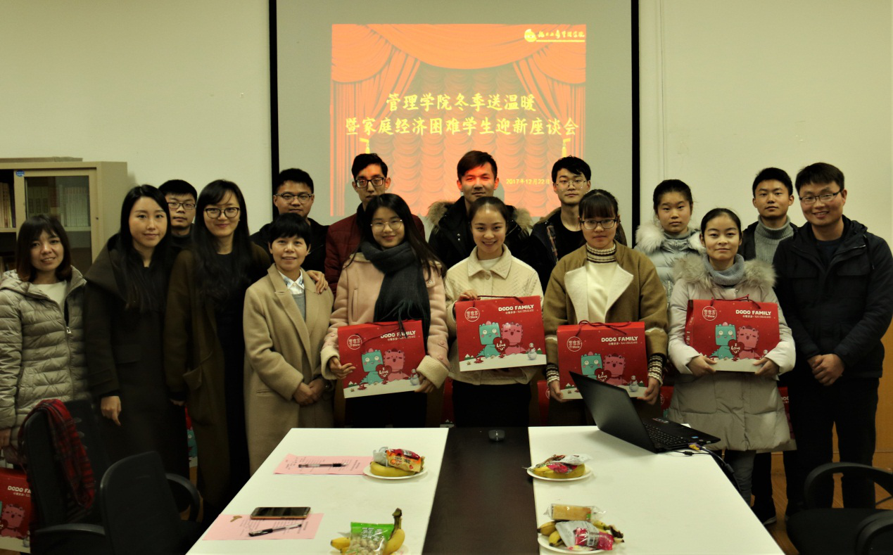 为更好地宣传贯彻落实国家精准资助政策,深入了解学院资助育人工作执行情况,倾听家庭经济困难学生所需所想,2017年12月22日,肉番 冬季送温暖暨家庭经济困难学生迎新座谈会在5118会议室举行。肉番 院长助理王丽华老师,大一年级组长花蕊老师,大一辅导员徐欣怡老师等出席,肉番 本硕各年级13名学生代表与会。座谈会由肉番 资助育人负责老师王健华主持。 座谈会上,王健华老师向与会学生代表送上新年祝福并简要介绍学院在过去一年资助育人工作概况,根据学院资助育人工作未来发展模式,对与会学生代表提出更高要求。学生代表结合实际分享各自生活、学习及社会工作情况,对学校和学院资助工作给予了充分肯定,也对育人工作中存在的不足提出意见和建议。 来自新疆哈密的阿不都萨拉木·吾甫尔说,国家助学贷款和学校全方位资助政策让他感到前所未有的温暖,作为一名来自偏远地区的贫困生,他更要发奋图强,争取更大的进步。17级新生雷鑫海说,大学生应该要有时间管理概念,合理分配学习与社会工作时间,作为一名阳光队员通过志愿服务、社会公益等活动,让自己实践能力、沟通能力得到综合提升,在助人中获得自助。 会上,教师代表花蕊和徐欣怡两位老师分别就学生代表提出的疑问进行答疑解惑。花蕊老师指出,大学教育是博雅教育,重点是培养人的思维方式,鼓励同学们要更多地去思考和疑问。徐欣怡老师谈到,物质资助是手段,精神扶贫是关键,作为管院阳光队一份子,常怀感恩之心,常行感恩之道。 王丽华老师在座谈会总结中用自身成长经历勉励学生代表们在学习上攻坚克难、在生活上自强自立、在工作中奋发图强。会后,老师们为学生代表送上新春大礼包并合影留念。 据悉,肉番 资助育人工作以“志存于心,愿携余手”为口号,以“感恩、奉献、有爱、互助、进步”为志愿服务宗旨,通过纵向优化志愿服务项目,横向拓展志愿活动类型两个维度,努力打造一支专业化、精品化学生团队,让每一位家庭经济困难学生在实践中锻炼自我,超越自我。