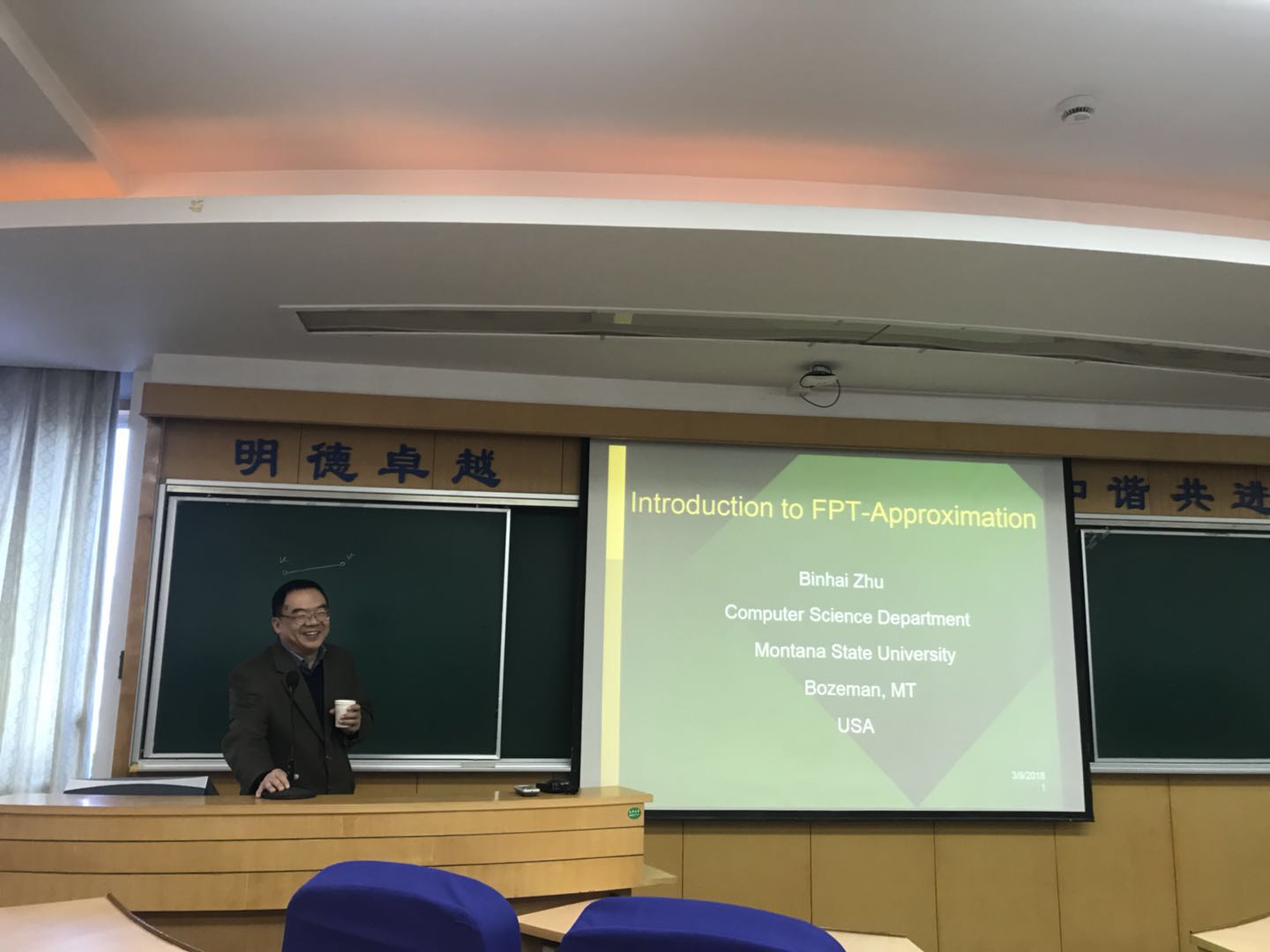 3月9日下午2点,美国蒙大拿州立大学朱滨海教授为肉番 全体师生做了一场题为“参数近似算法简介”的学术报告,报告会在旭日楼306教室举行,由郑斐峰副院长主持。