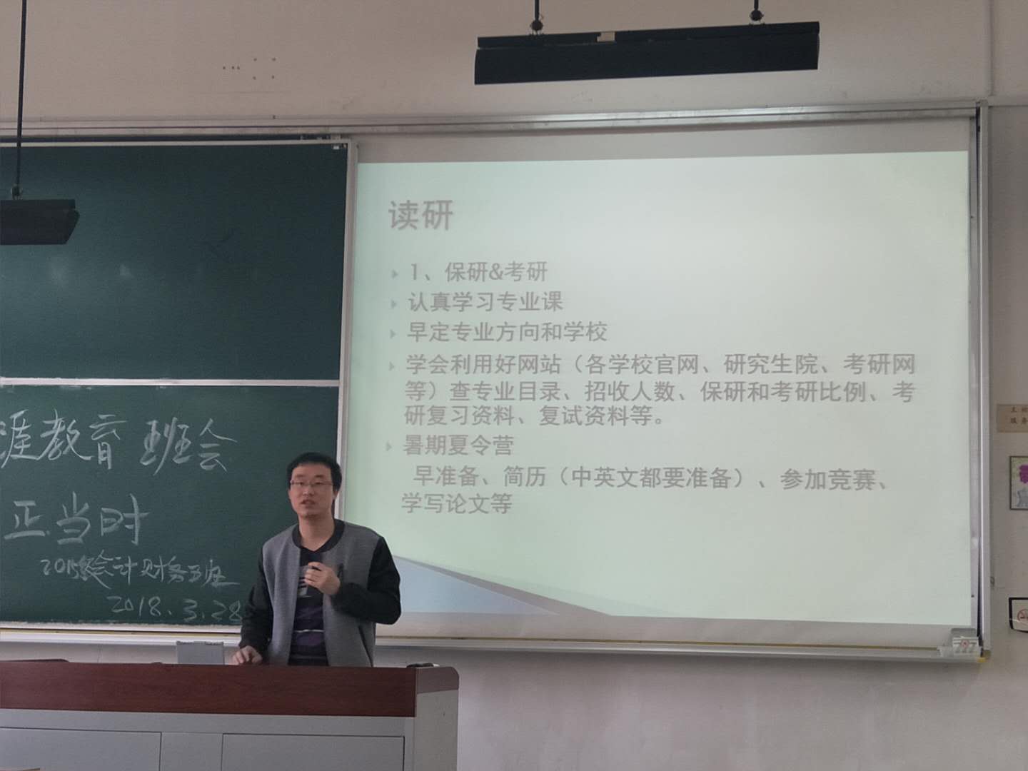 2018年3月28日,会计系“职业生涯教育”主题班会在四教105教室开展。此次班会面向会计学专业、财务管理专业共四个班级的同学,由辅导员徐志德老师对各班上一学年的学习情况进行总结,中国电信上海公司人力资源部骆巍先生为同学们做出专业培养及职业规划方面的指导。 徐志德老师首先对各班同学在上一学期的成绩情况进行总体的点评与分析,并鼓励同学们在大三的最后阶段再接再厉。