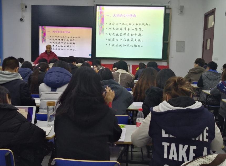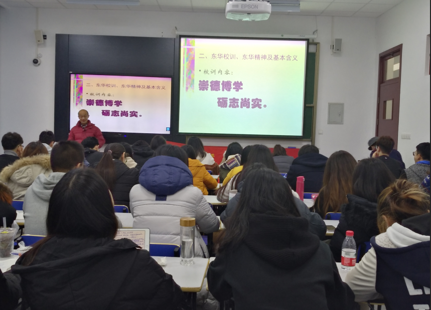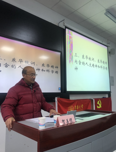 2018年12月11日,肉番 2018年预备党员培训班学员在一教210聆听了一场主题为“东华校训与东华精神”的党课。主讲人关工委讲师团成员贺善侃教授从东华的校训和东华的精神出发,深入探究和剖析校训的文化起源和内涵,鼓励每一位东华人践行东华精神,做杰出东华人。贺教授生动又深刻的演讲,让每位学员对东华校训和精神有了更深的解读。 本次报告分为五个部分,分别是大学的文化使命、东华校训和精神的基本含义、东华校训和精神内含的人文精神和科学精神、校训和精神的历史底蕴以及践履东华精神、做杰出东华人。