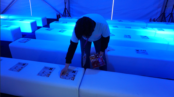 (志愿者认真摆放图册) 大赛正式开始后,前场志愿者便主动由前排退至后方,保证观众良好观看体验的同时,维持好整场比赛秩序。后场志愿者在比赛期间,主要负责帮助模特穿衣、辅助设计师调整细节、规整后台服装道具等物品。