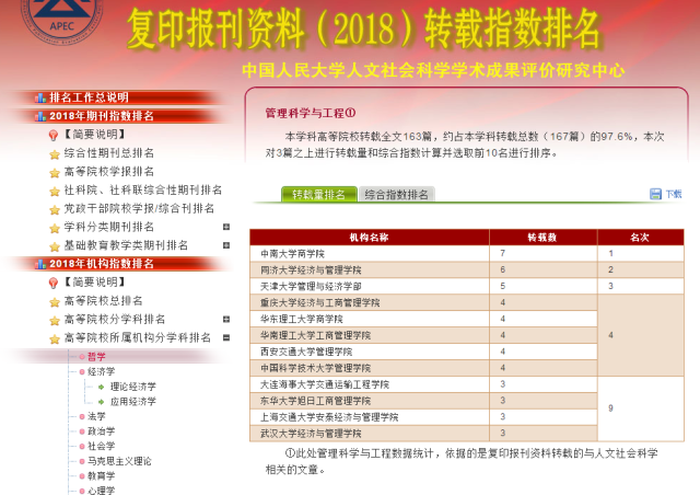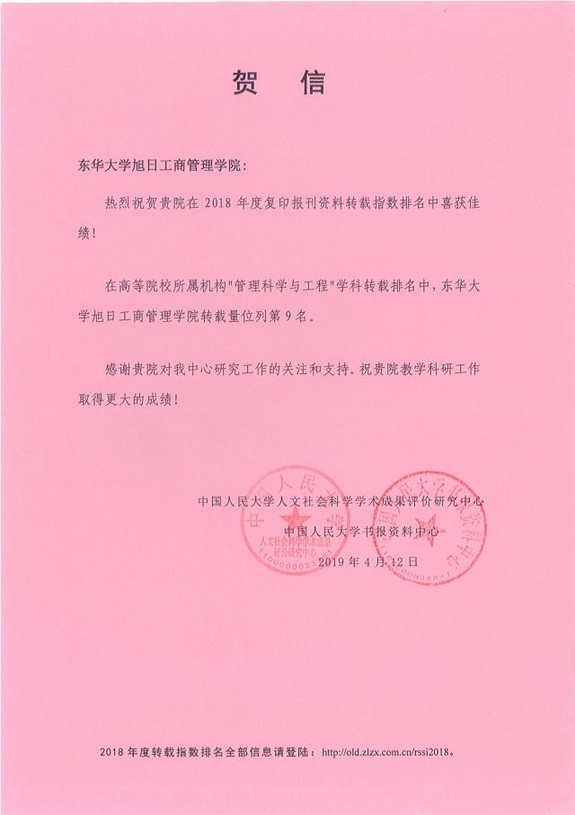 近日,我院在2018年度复印报刊资料转载指数排名中获得佳绩,并收到中国人民大学人文社会科学学术成果评价研究中心、中国人民大学书报资料中心联合发来的贺信。 2018年度 “管理科学与工程”学科高等院校转载全文共163篇,我院3篇论文被转载,在人大报刊资料高等院校所属机构转载排名中,转载量位列全国第9名。 复印报刊资料转载指数排名由中国人民大学人文社会科学学术成果评价研究中心与中国人民大学书报资料中心联合发布,评价中国人文社科学术期刊和教学科研机构的学术研究成果,受到学术期刊界、教学科研机构和广大人文社会科学工作者的广泛关注,成为国内各类人文社科学术评价的主要依据之一。近年来,我院高度重视科学研究和学科建设,积极推进学院改革发展,此项荣誉获得标志着我院管理科学与工程学科在国内已形成一定的影响力。 复印报刊资料转载指数排名(2018年度)发布链接 //old.zlzx.com.cn/rssi2018/index.ht