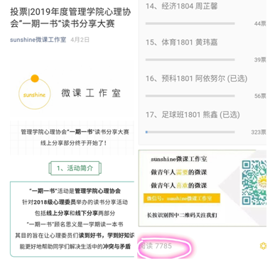 (线上分享投票结果) 从上学期寒假前第一位心理委员满怀热情地拿到这本书开始;再到紧张激烈的线上投票环节,在浏览量高达7780的投票推送里选出了的票数最高的前十位心理委员进入线下决赛环节;整个线下决赛环节将《非暴力沟通》这本书划分成了十个部分,十位心理委员通过抽签的方式拿到了自己的主题,并按书上的顺序进行分享。比赛中,十位参赛选手通过概念的解释,案例的分析,对自己的启示等方面进行分享。整本书的主要内容,由十名心理委员“拼盘”式呈现给现场的所有老师和同学,让同学们受益匪浅,收获心灵的触动。最终评选出网络人气奖1名,一等奖1名,二等奖2名,三等奖3名,优秀奖4名。